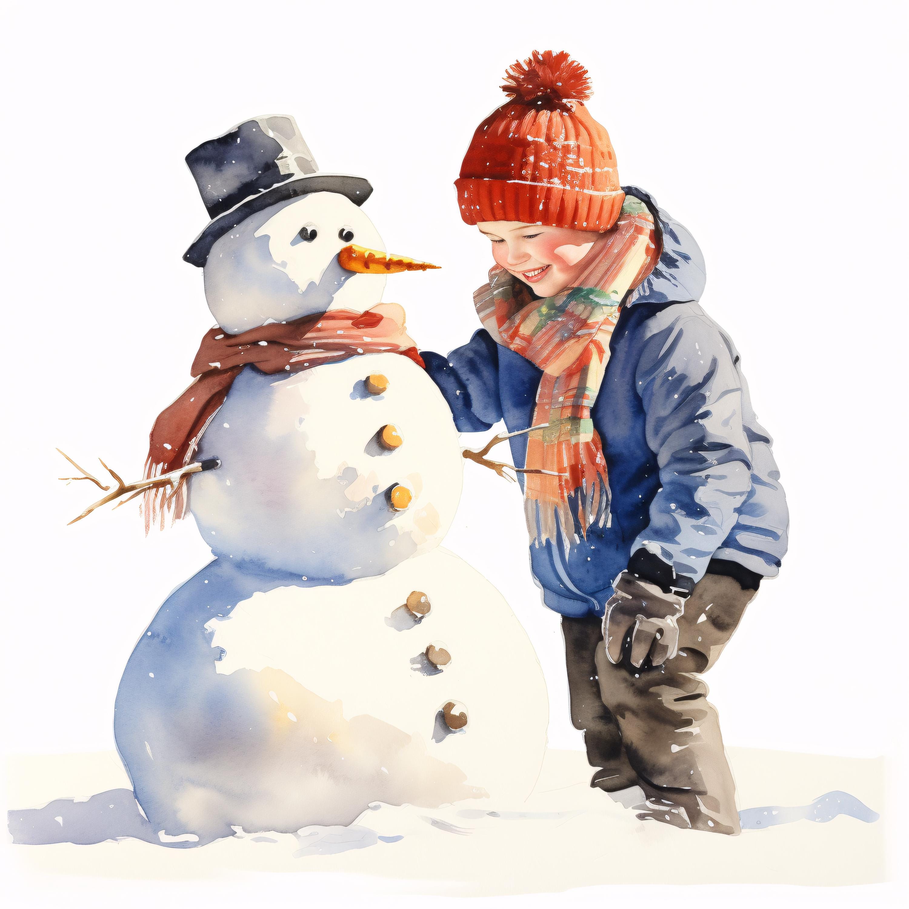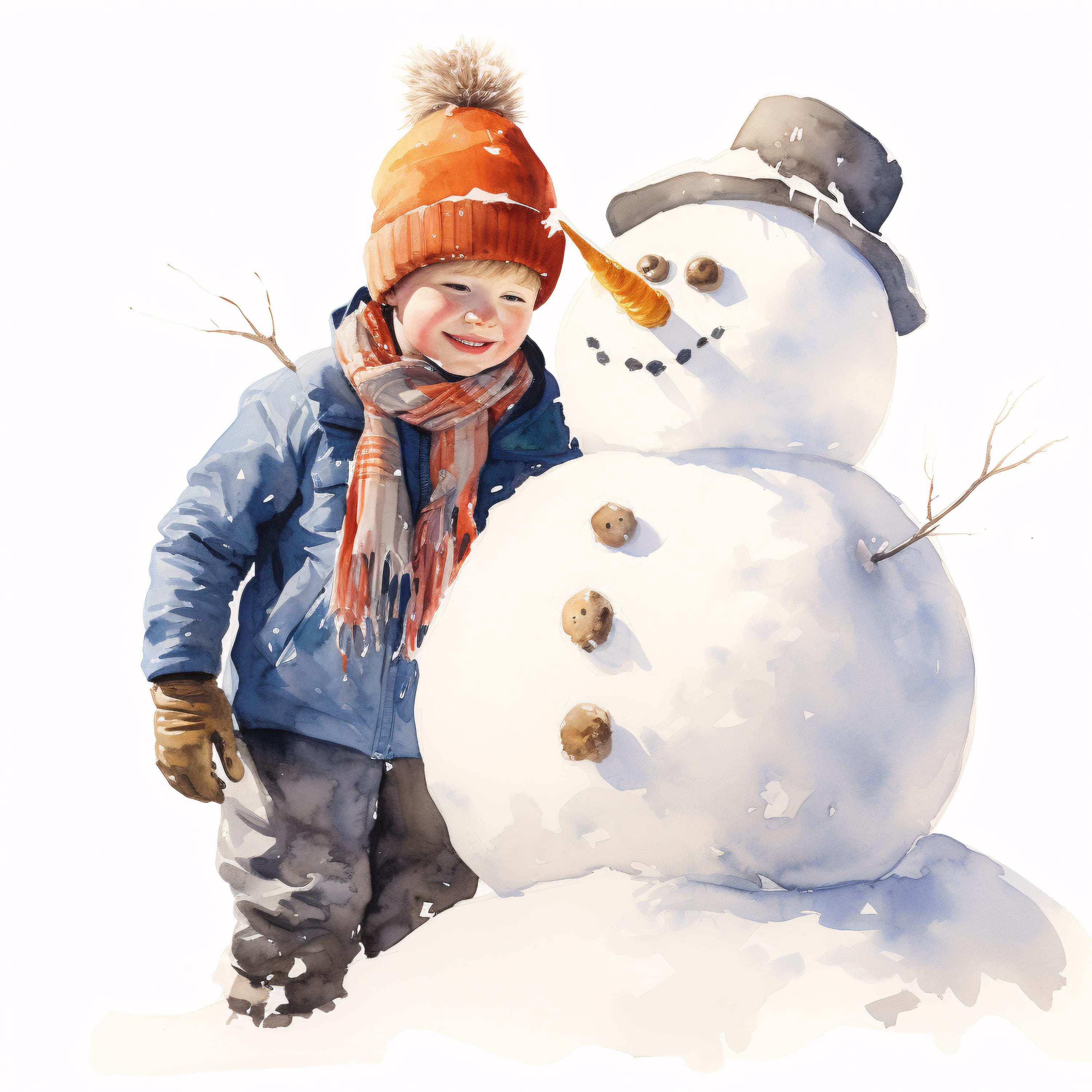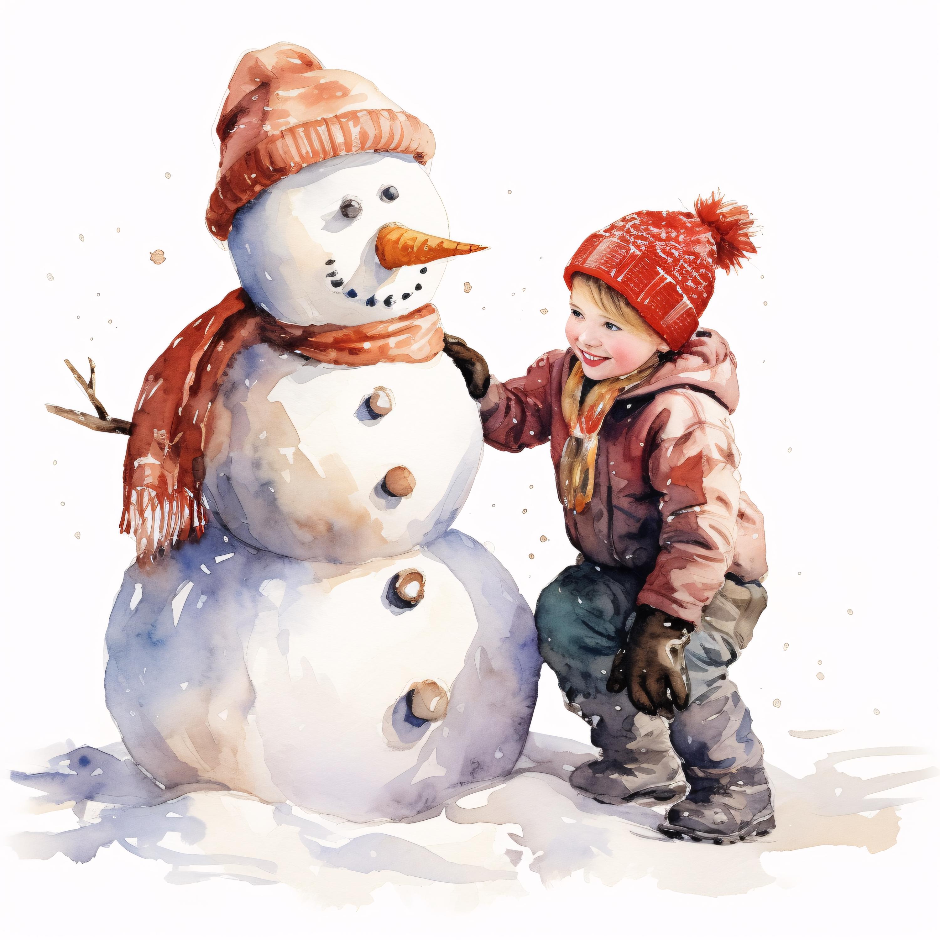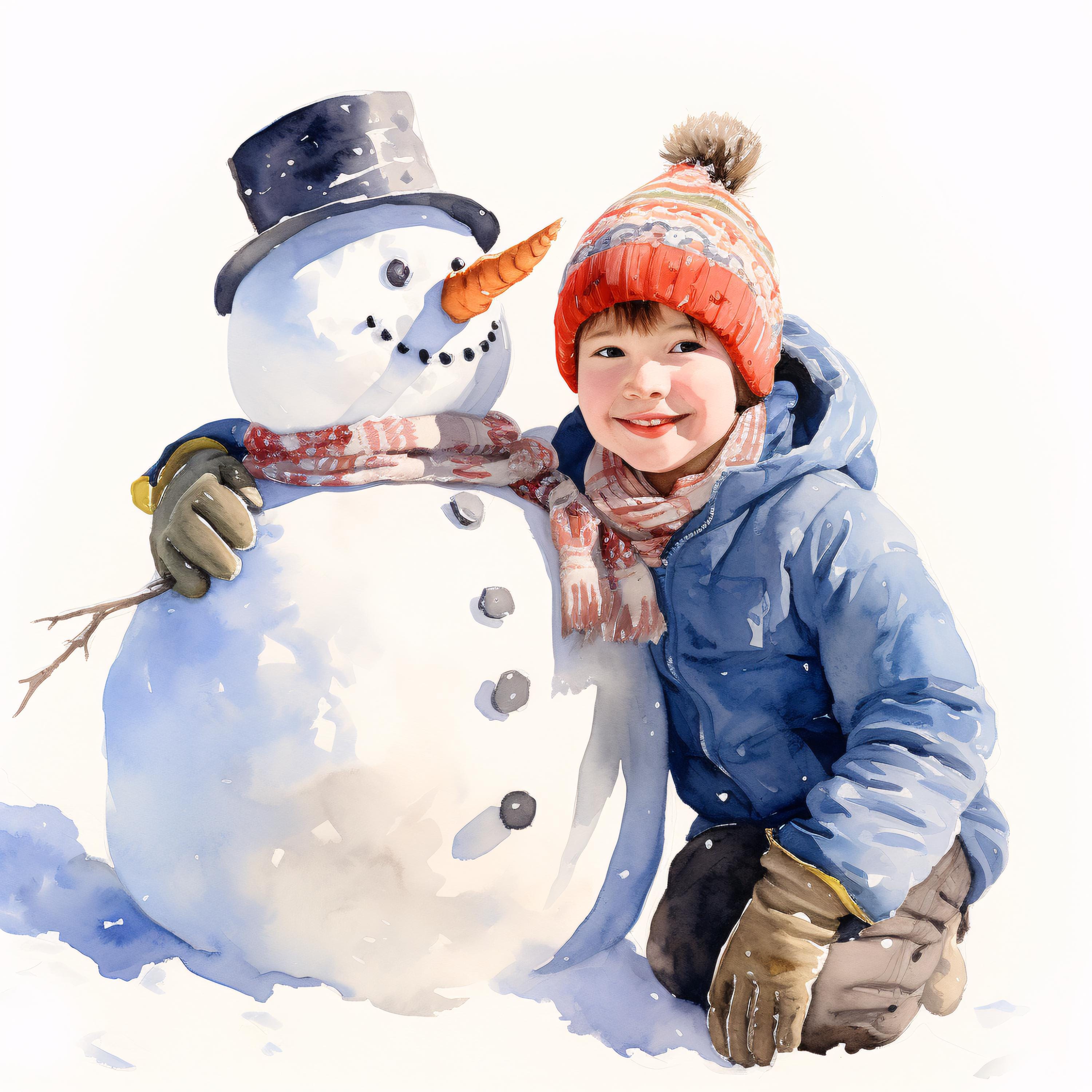 Boy and Snowman Clipart, Winter Fun Images, 10 Watercolor Clip Art, Printable JPGs, Instant Download, Commercial Use, Paper craft