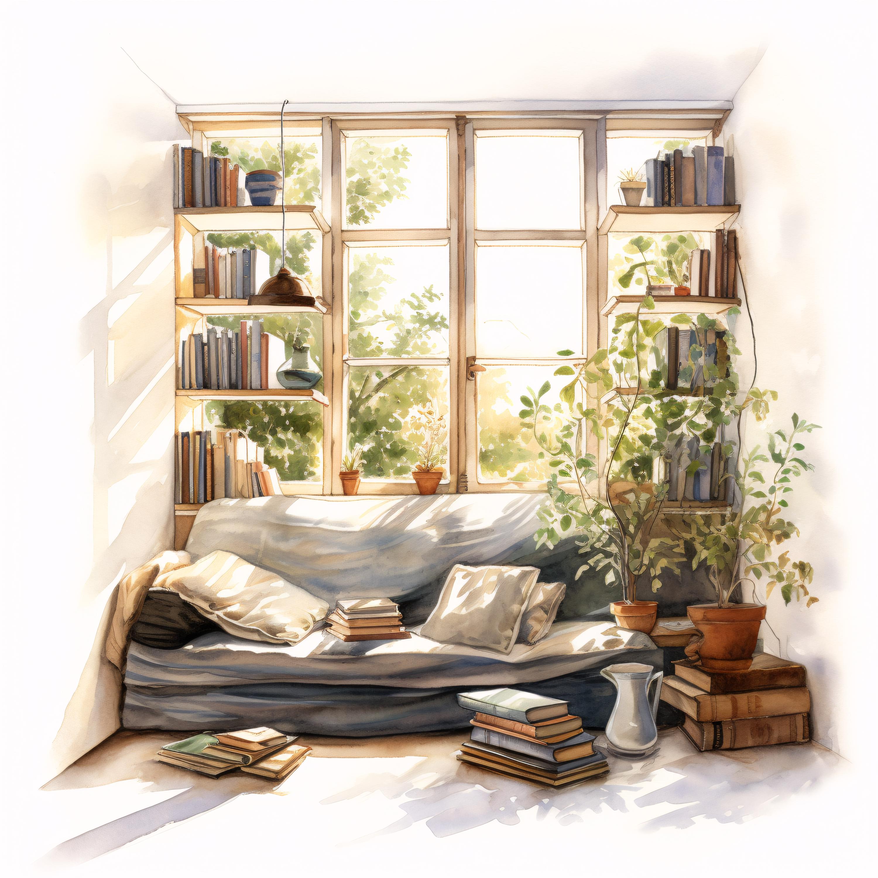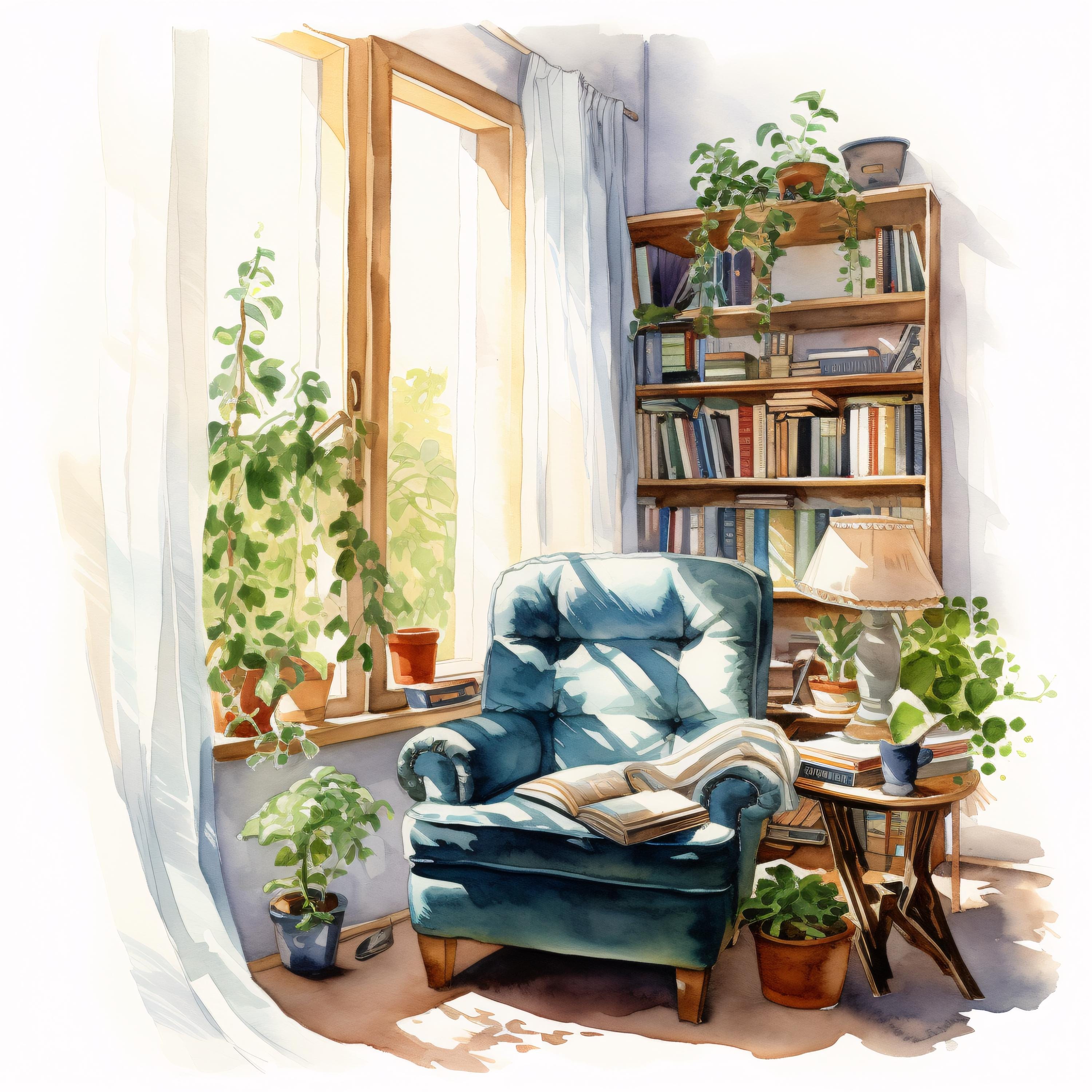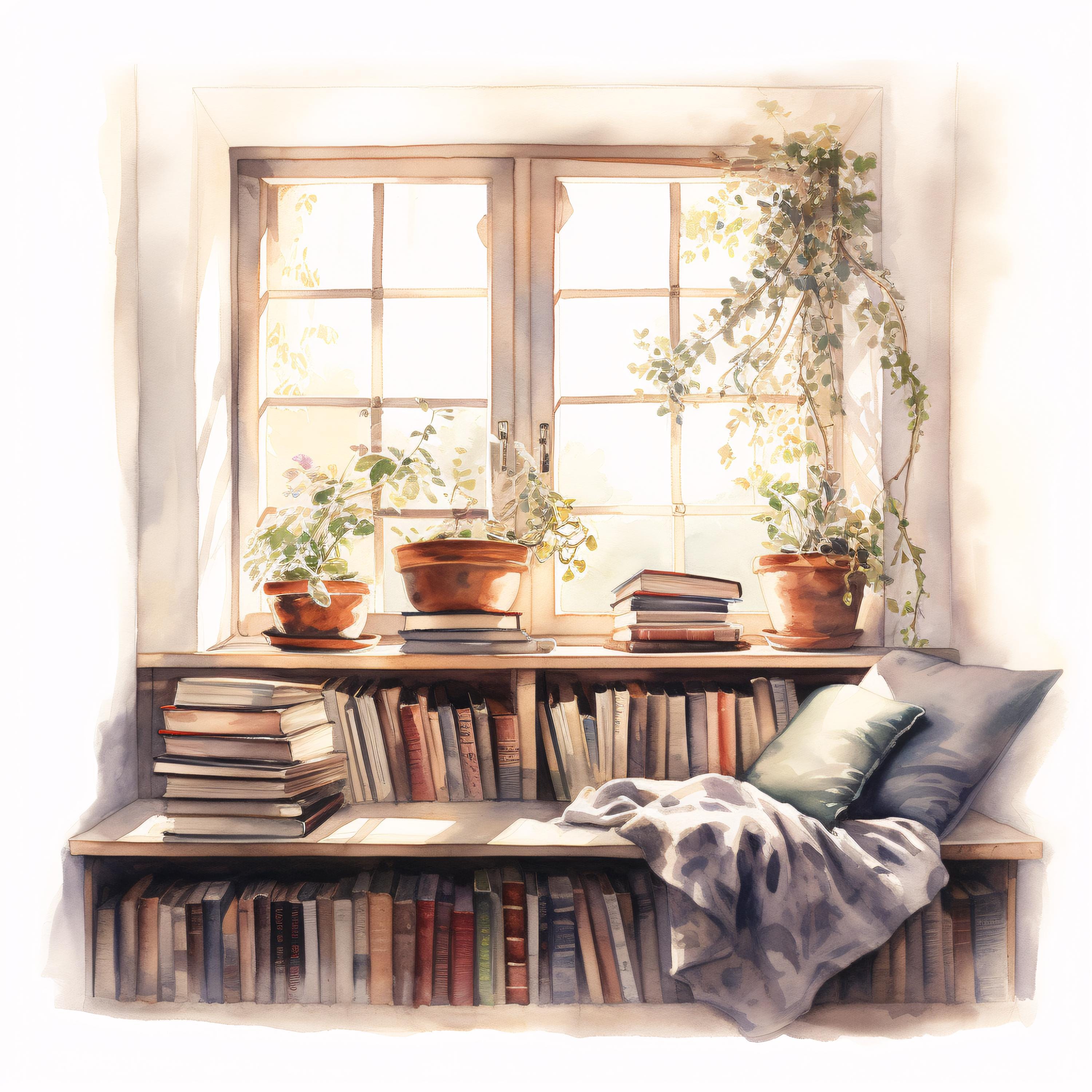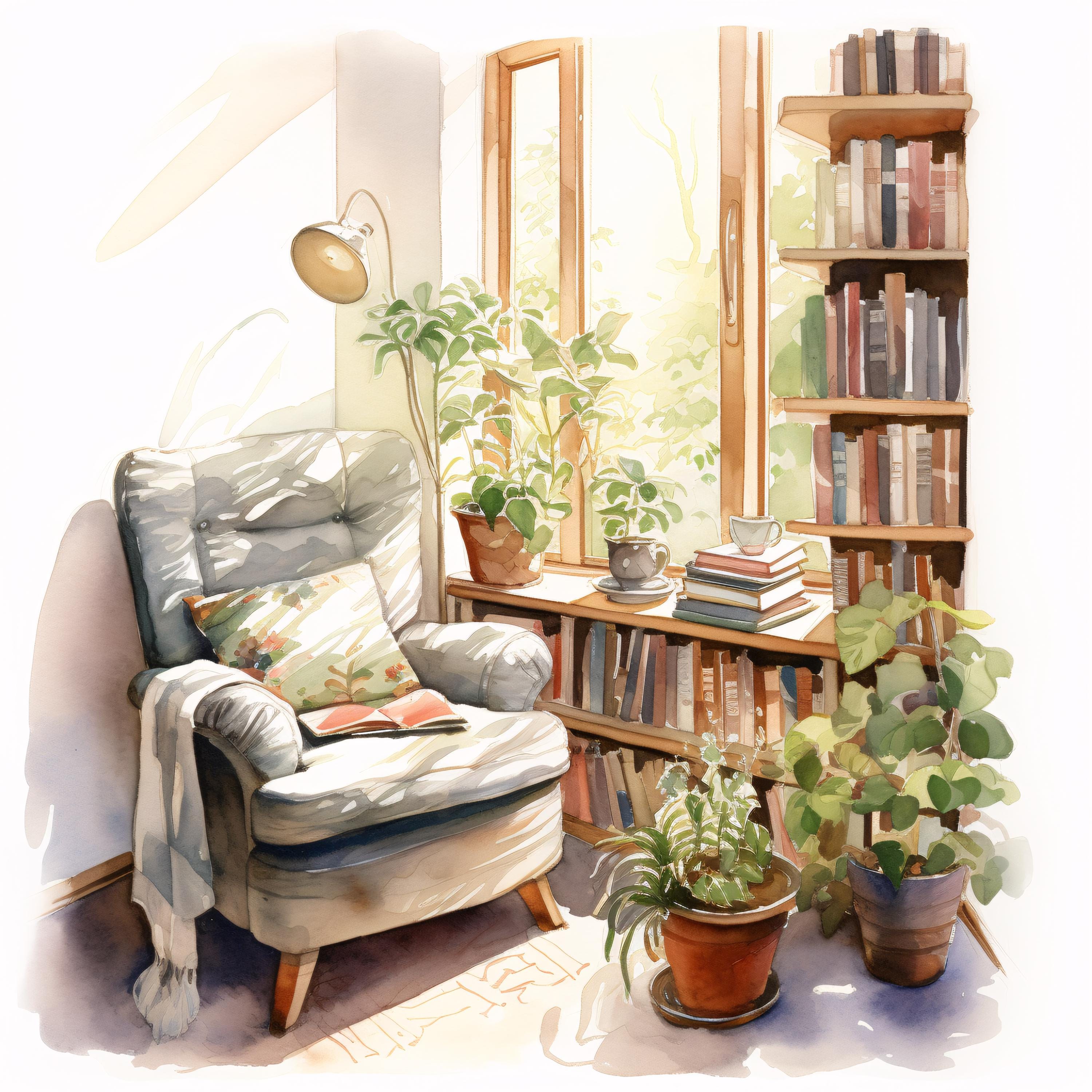 Cozy Book Nook Clipart, Reading Corner Images, 10 Watercolor Clip Art, Printable JPGs, Instant Download, Commercial Use, Paper craft