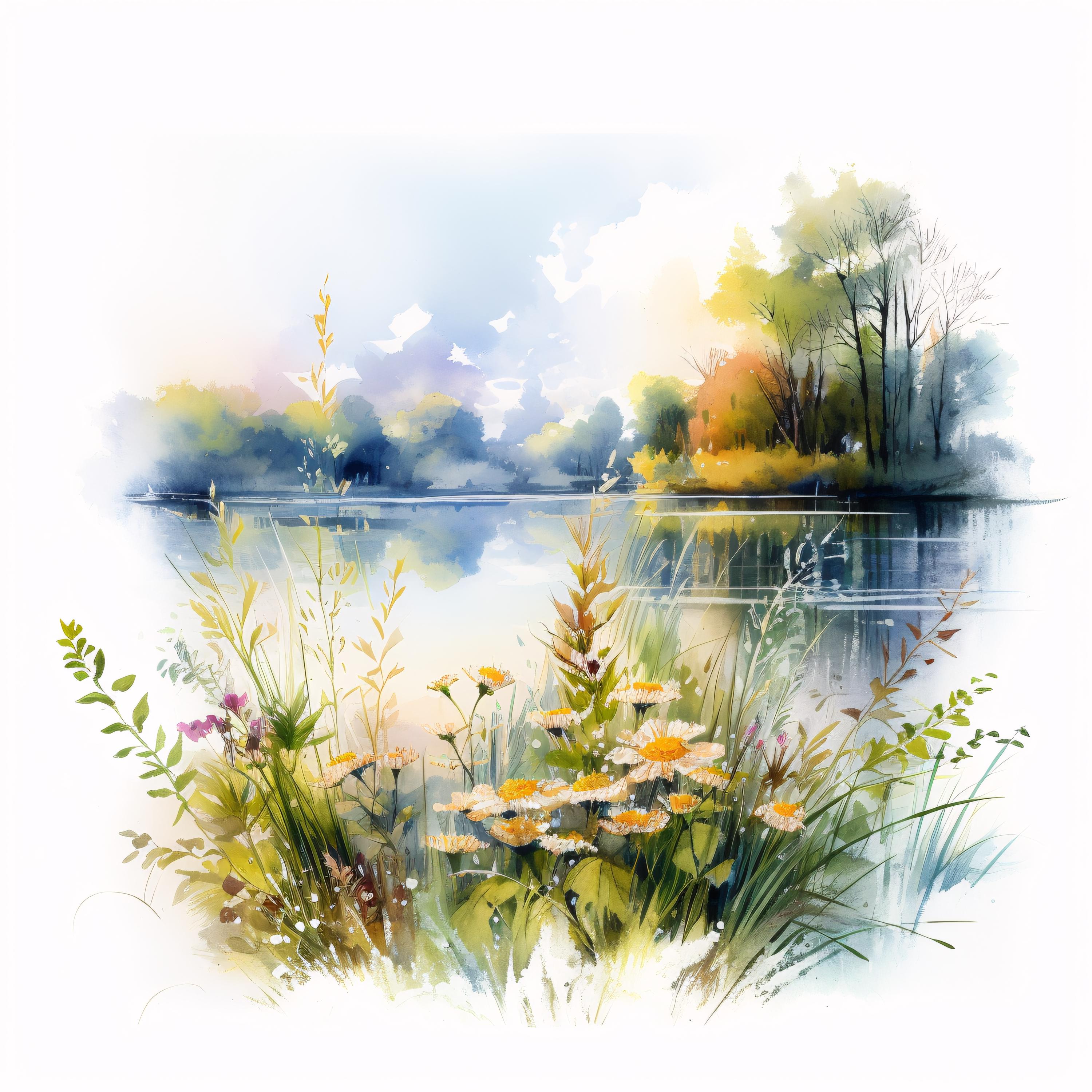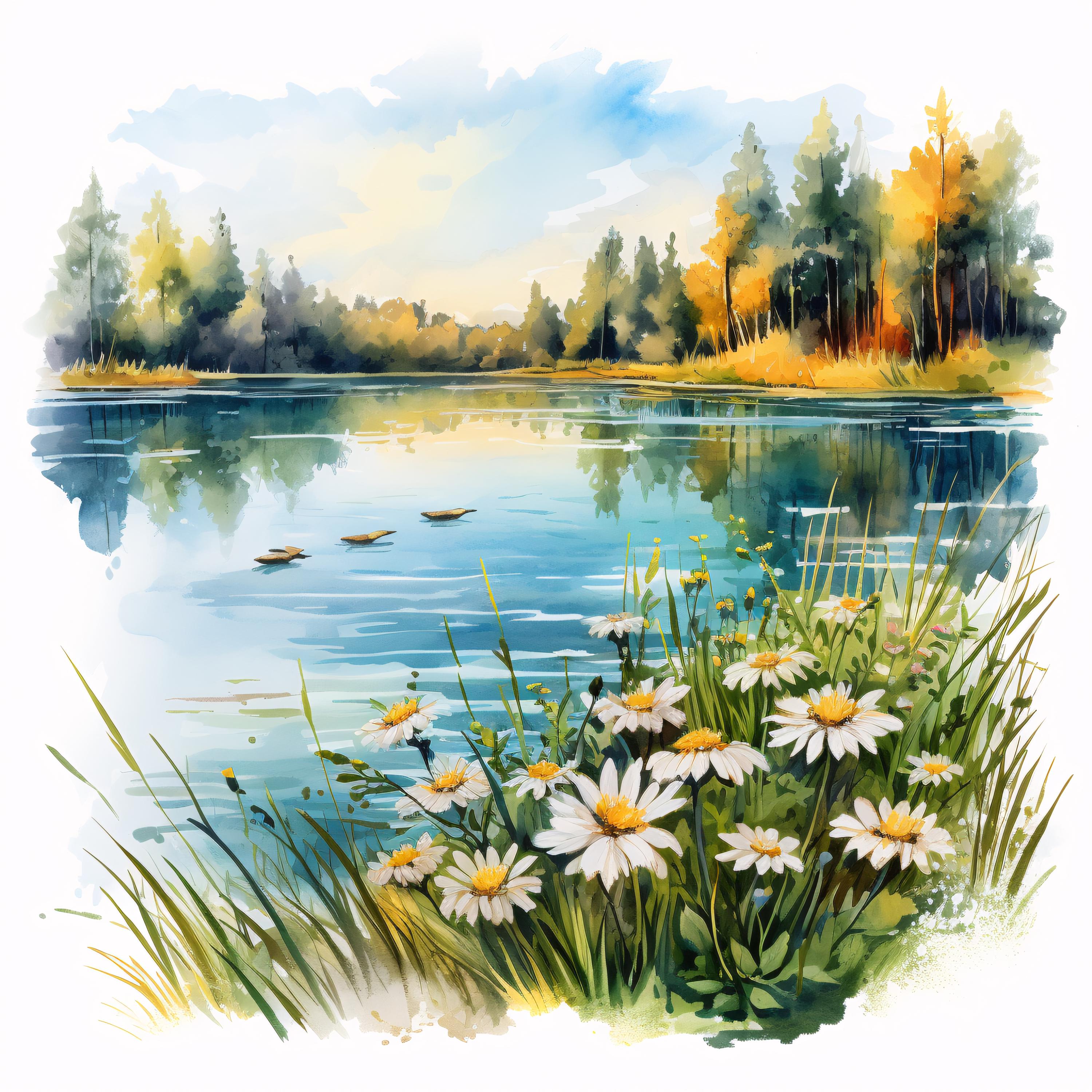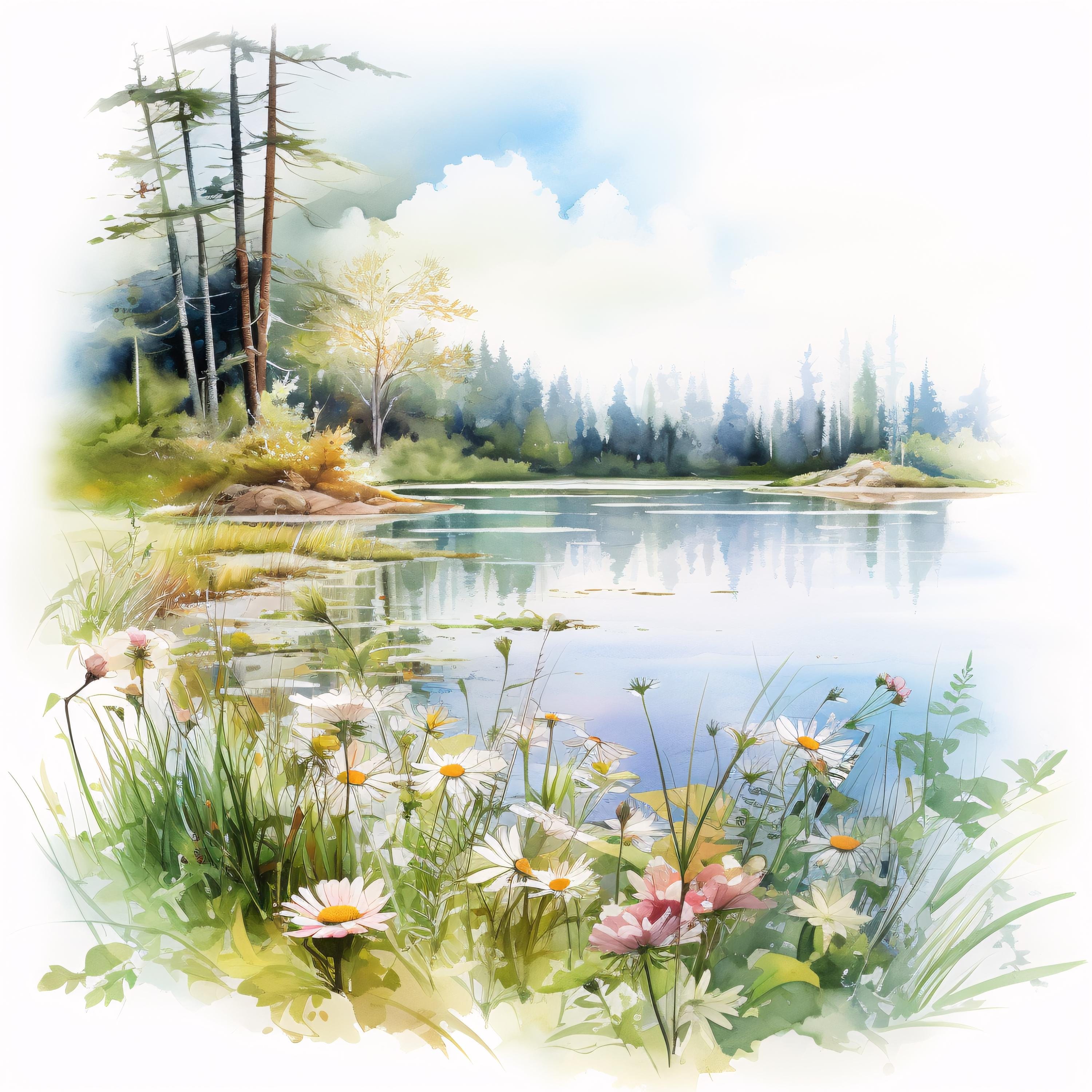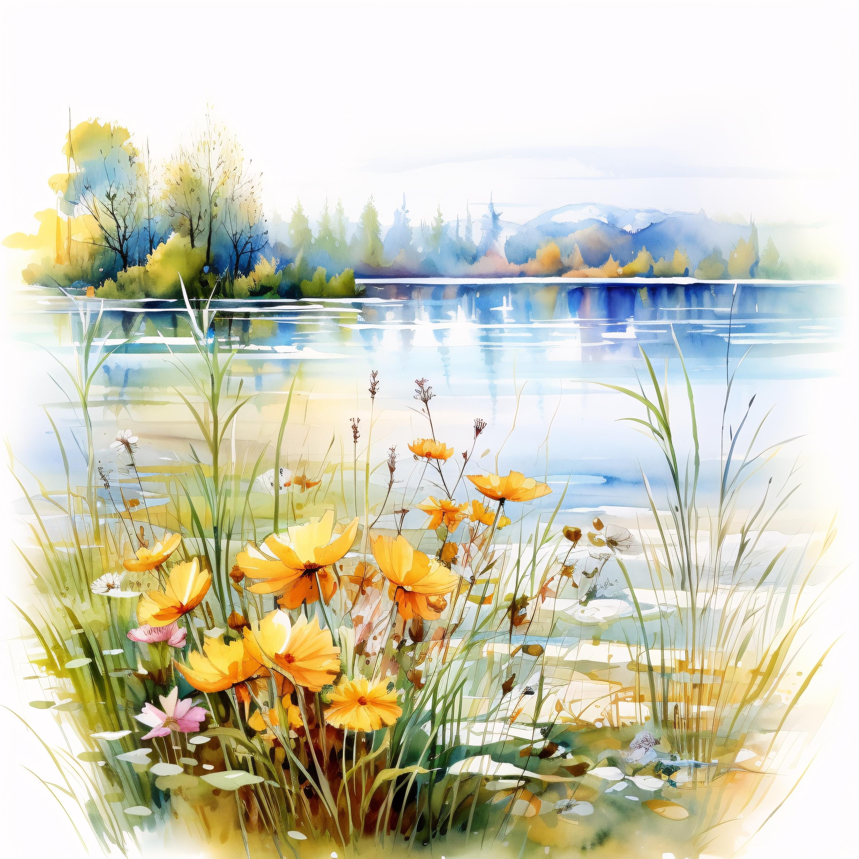 Lake and Wildflowers Clipart, Nature Landscape Images, 10 Watercolor Clip Art, Printable JPGs, Instant Download, Commercial Use, Paper craft