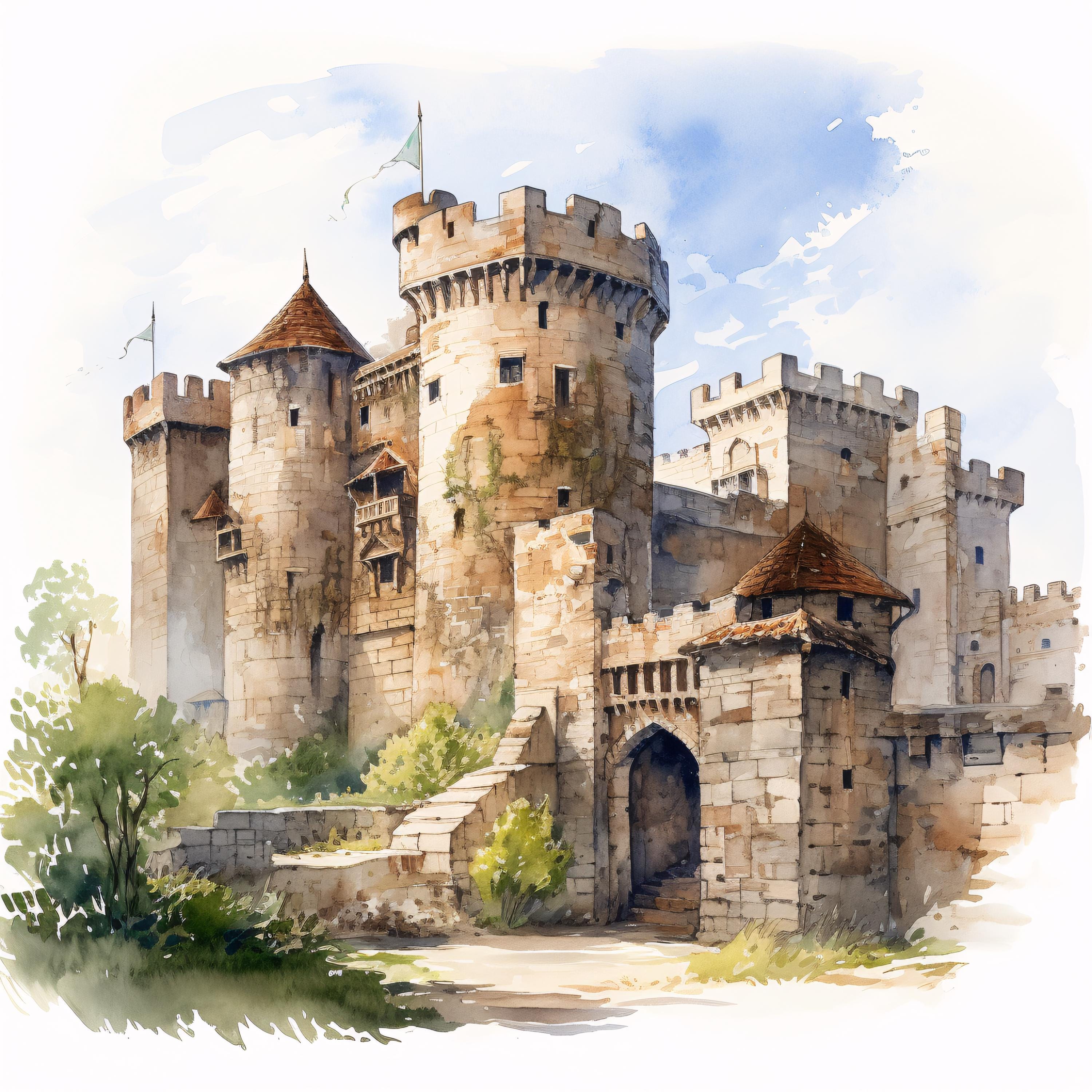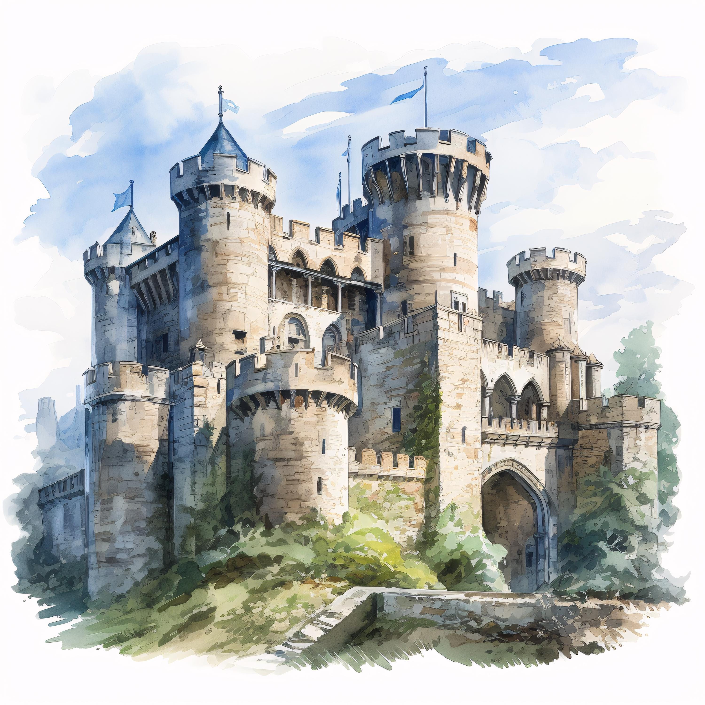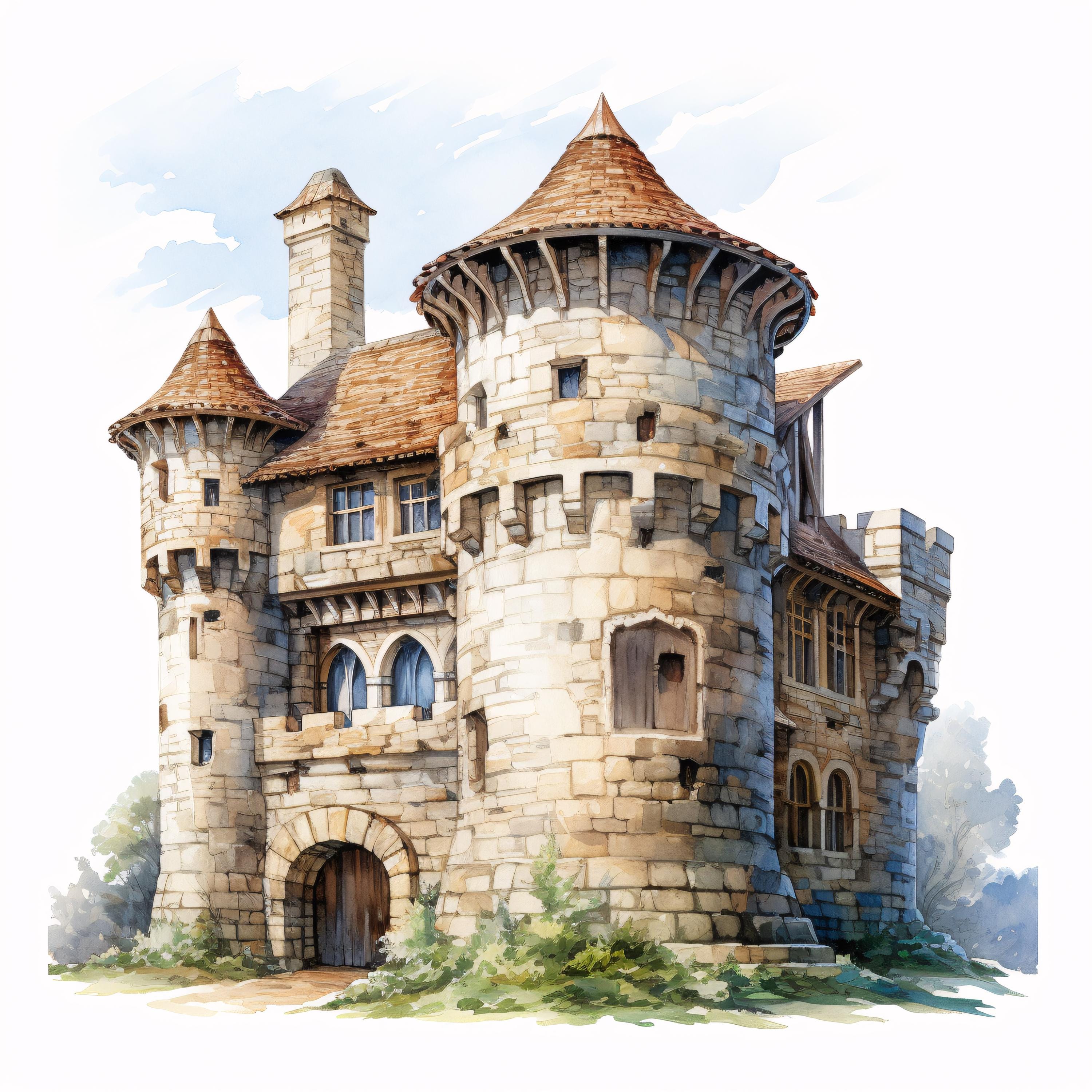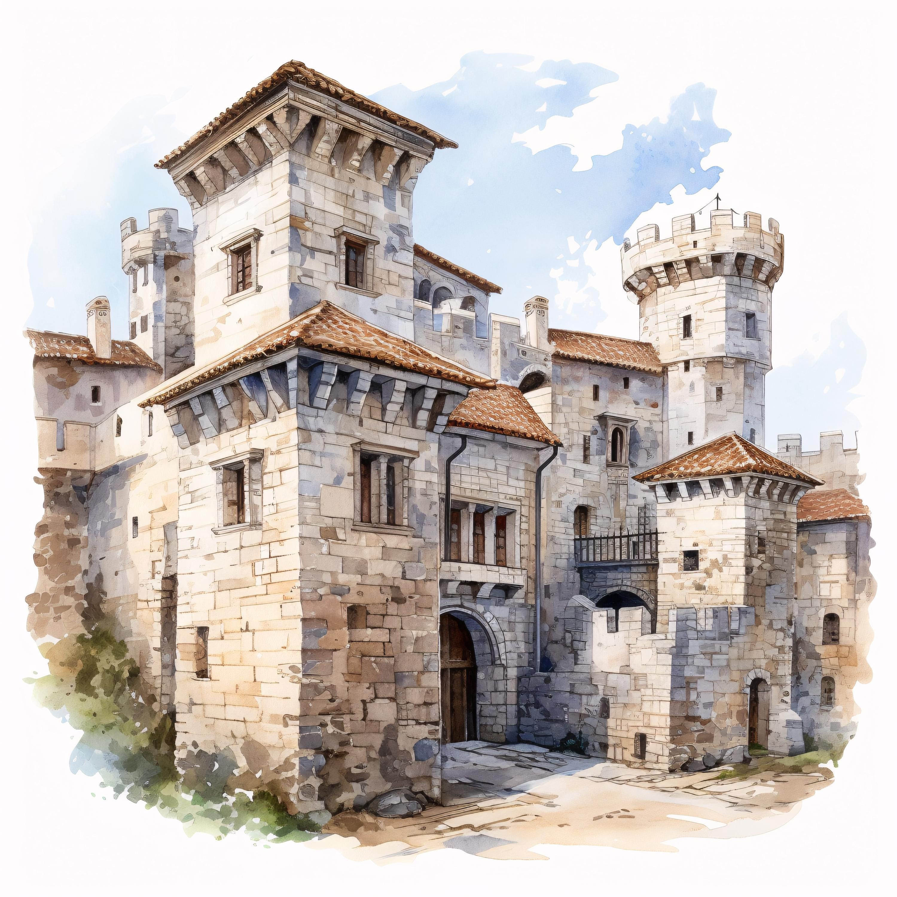 Medieval Castle Clipart, Fantasy Fortress Images, 10 Watercolor Clip Art, Printable JPGs, Instant Download, Commercial Use, Paper craft