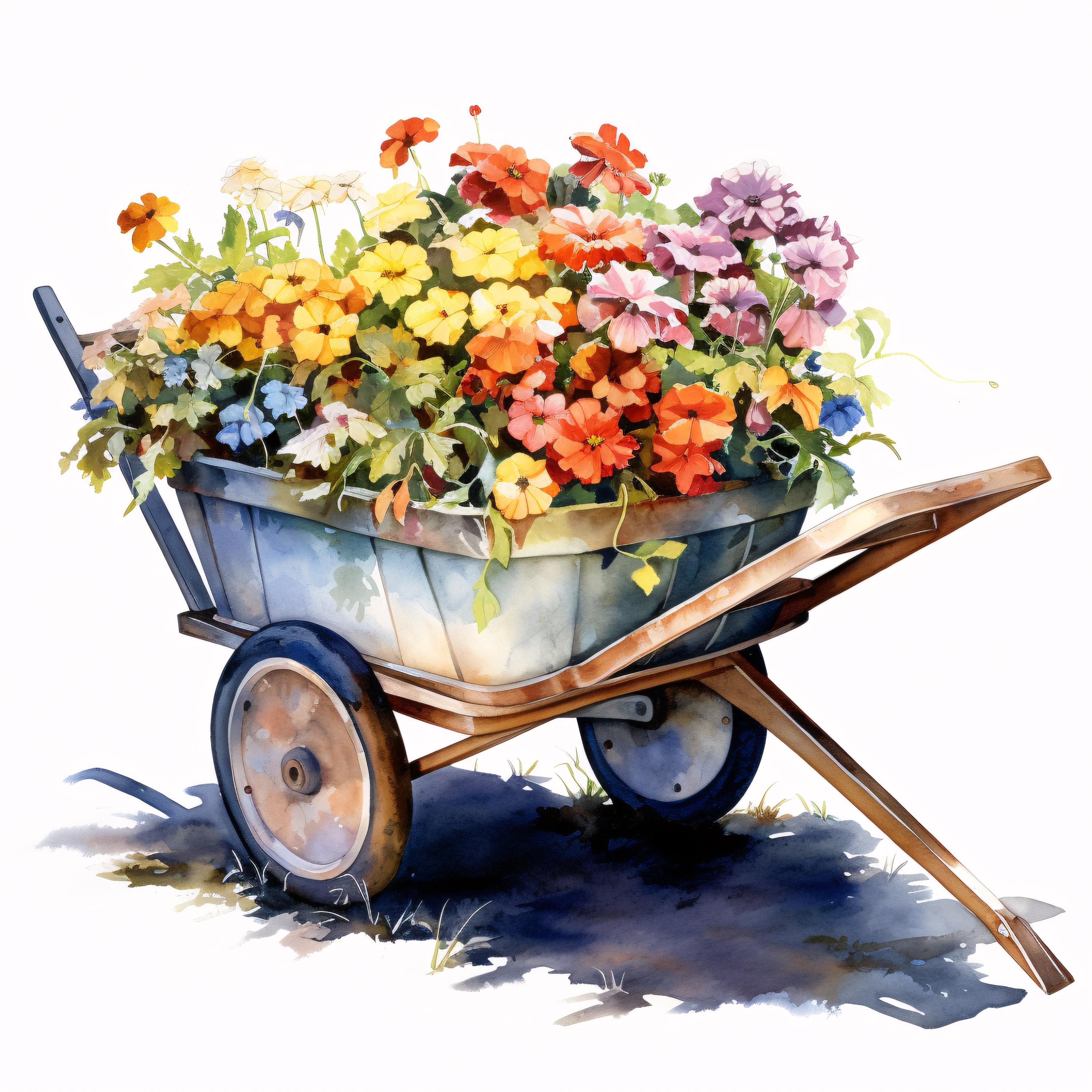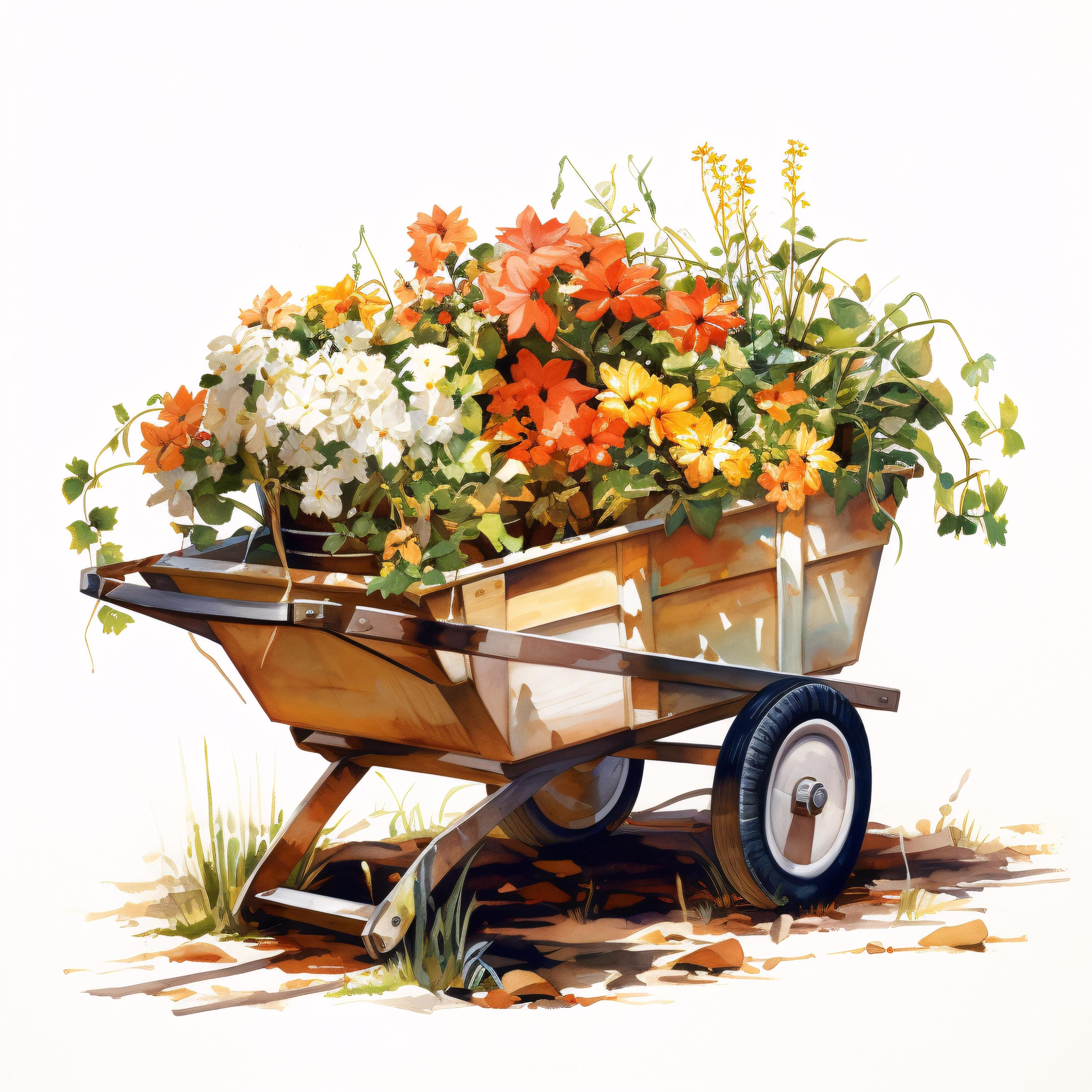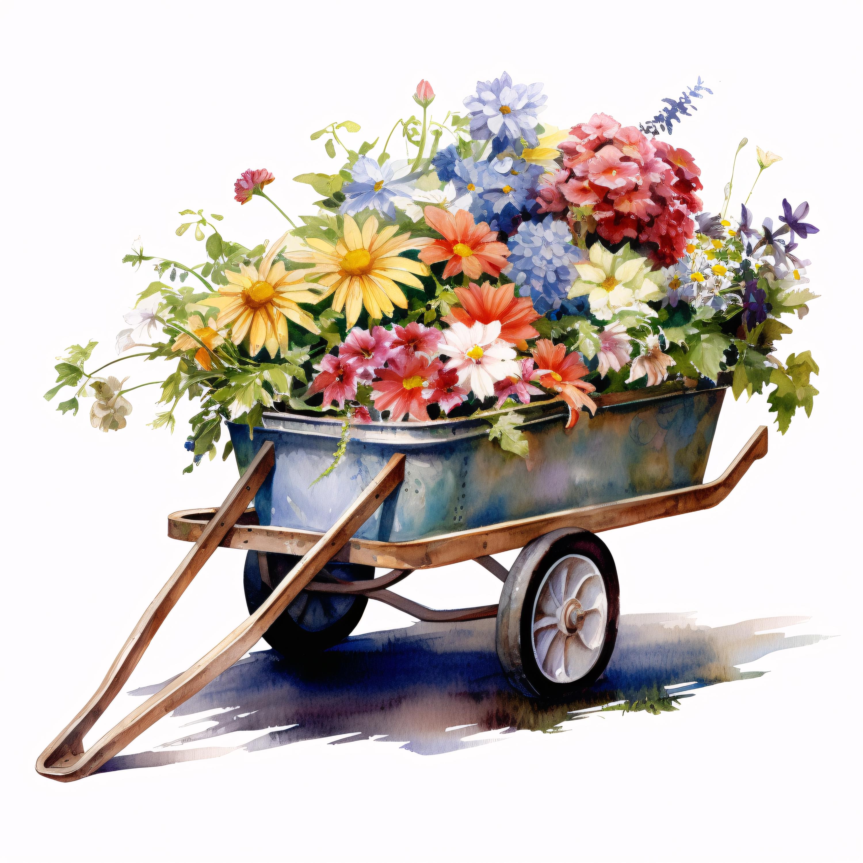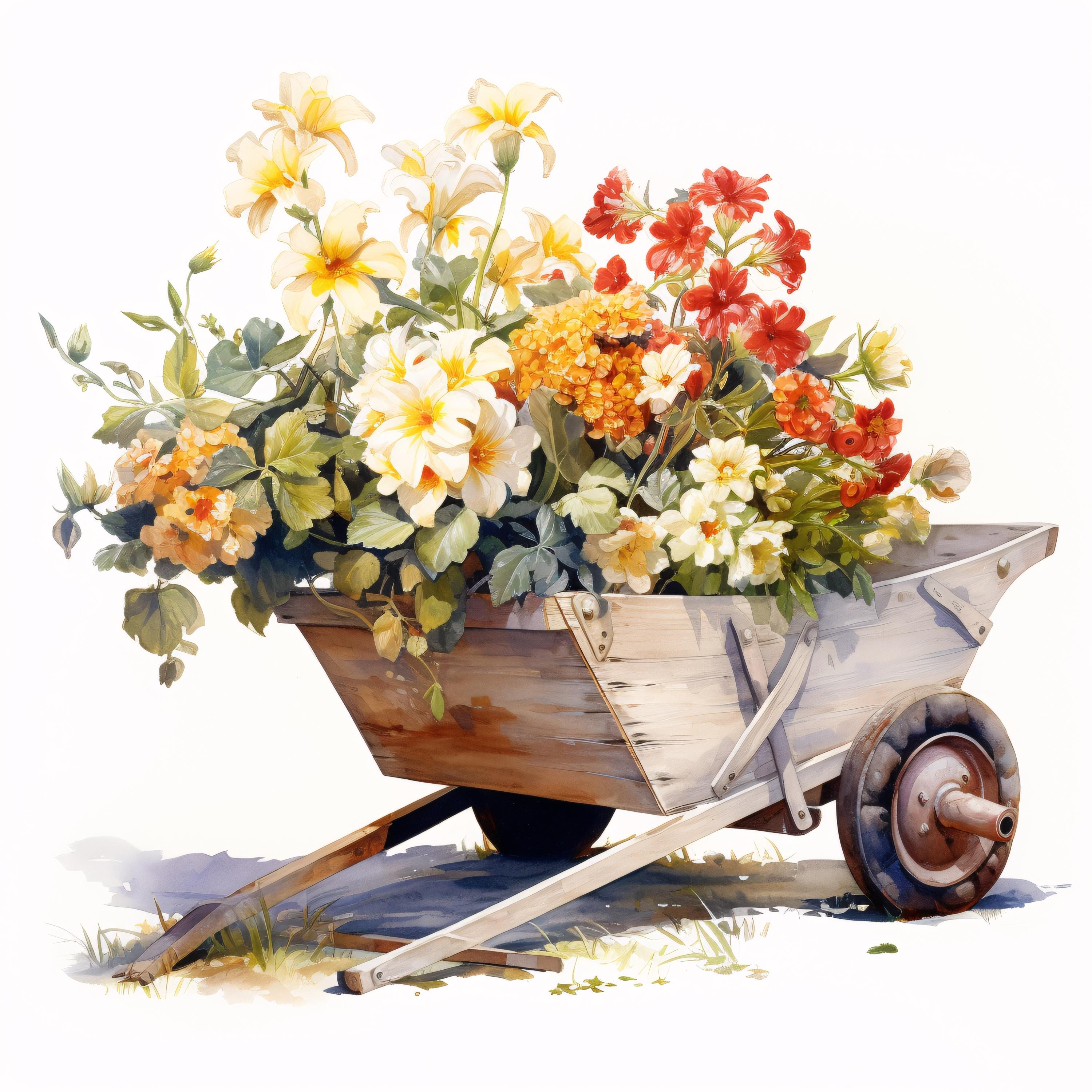 Flower Wheelbarrow Clipart, Garden Flower Cart Images, 10 Watercolor Clip Art, Printable JPGs, Instant Download, Commercial Use, Paper craft