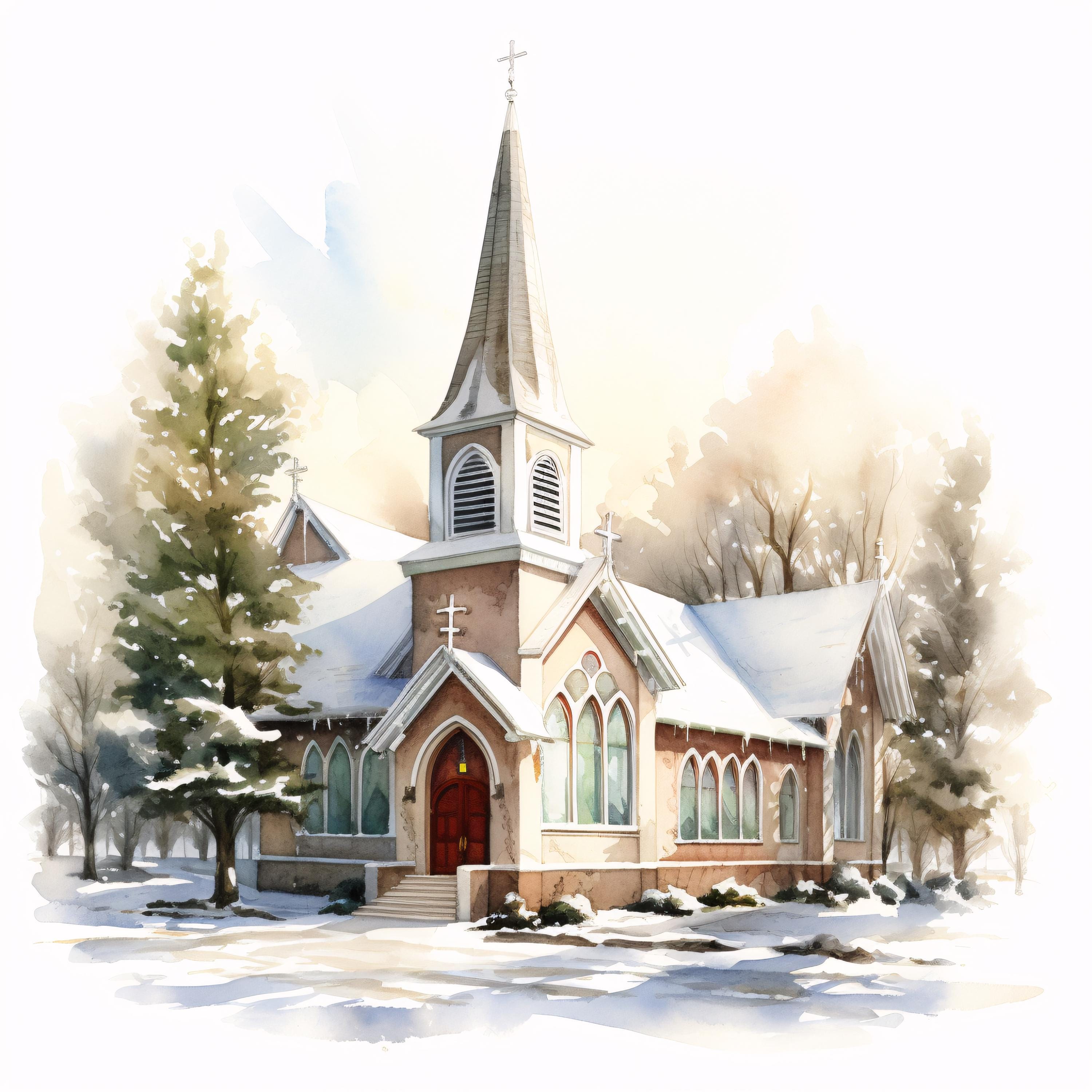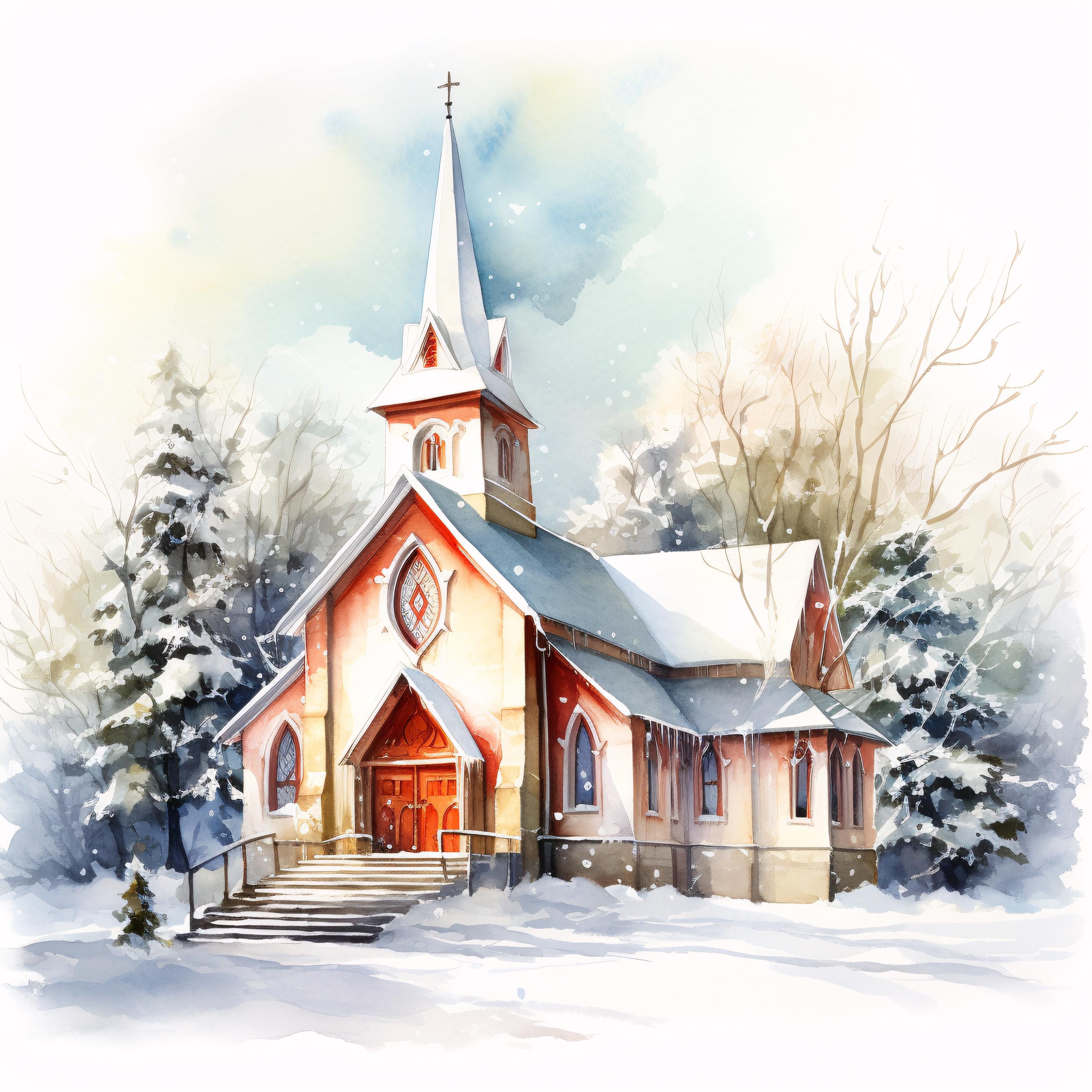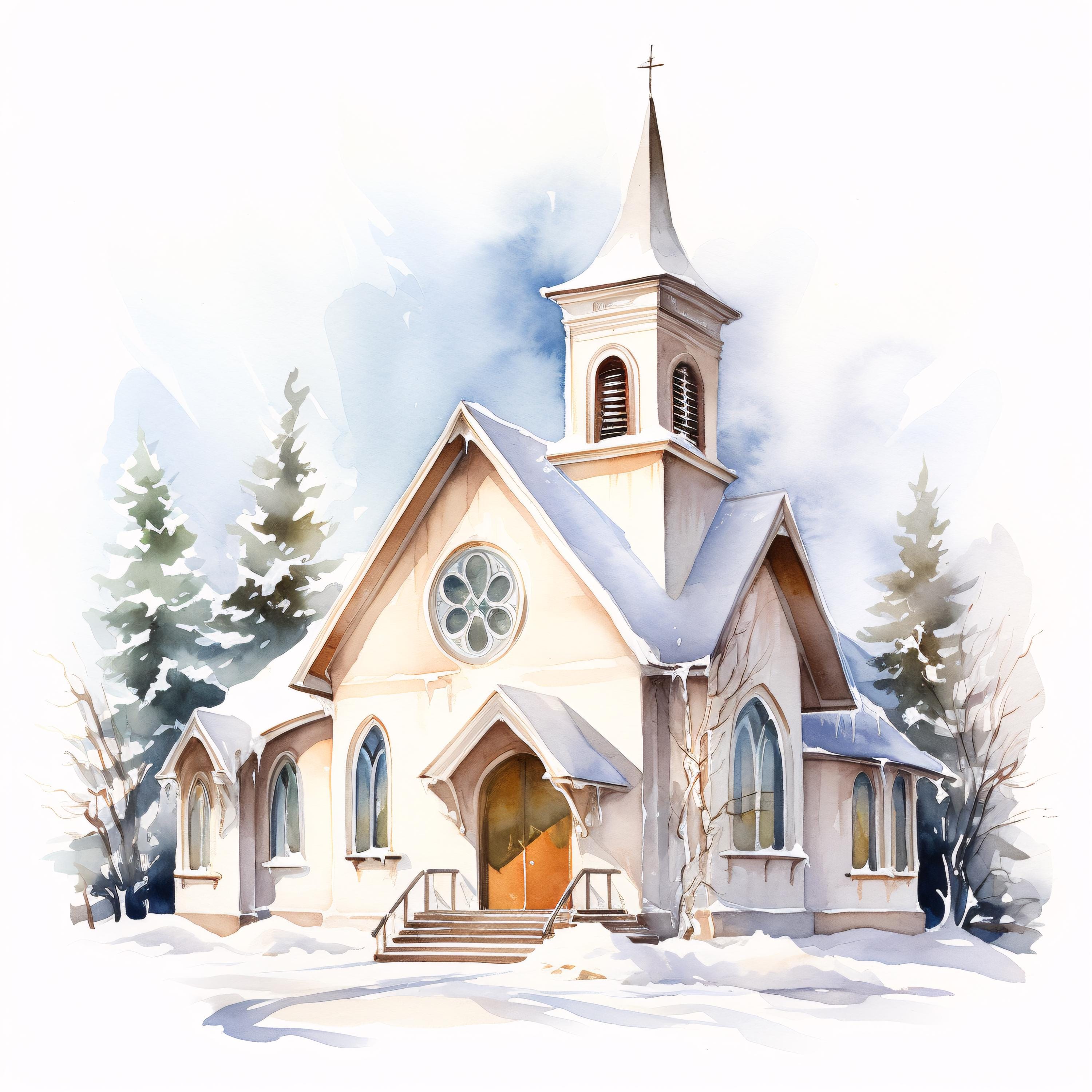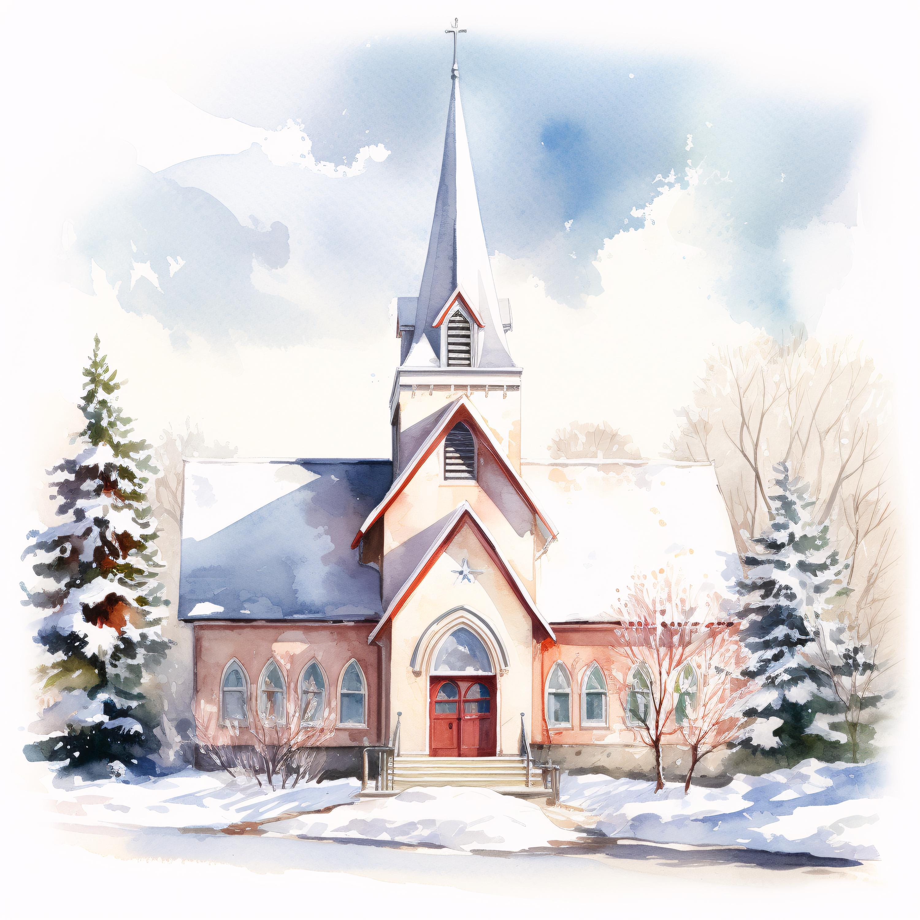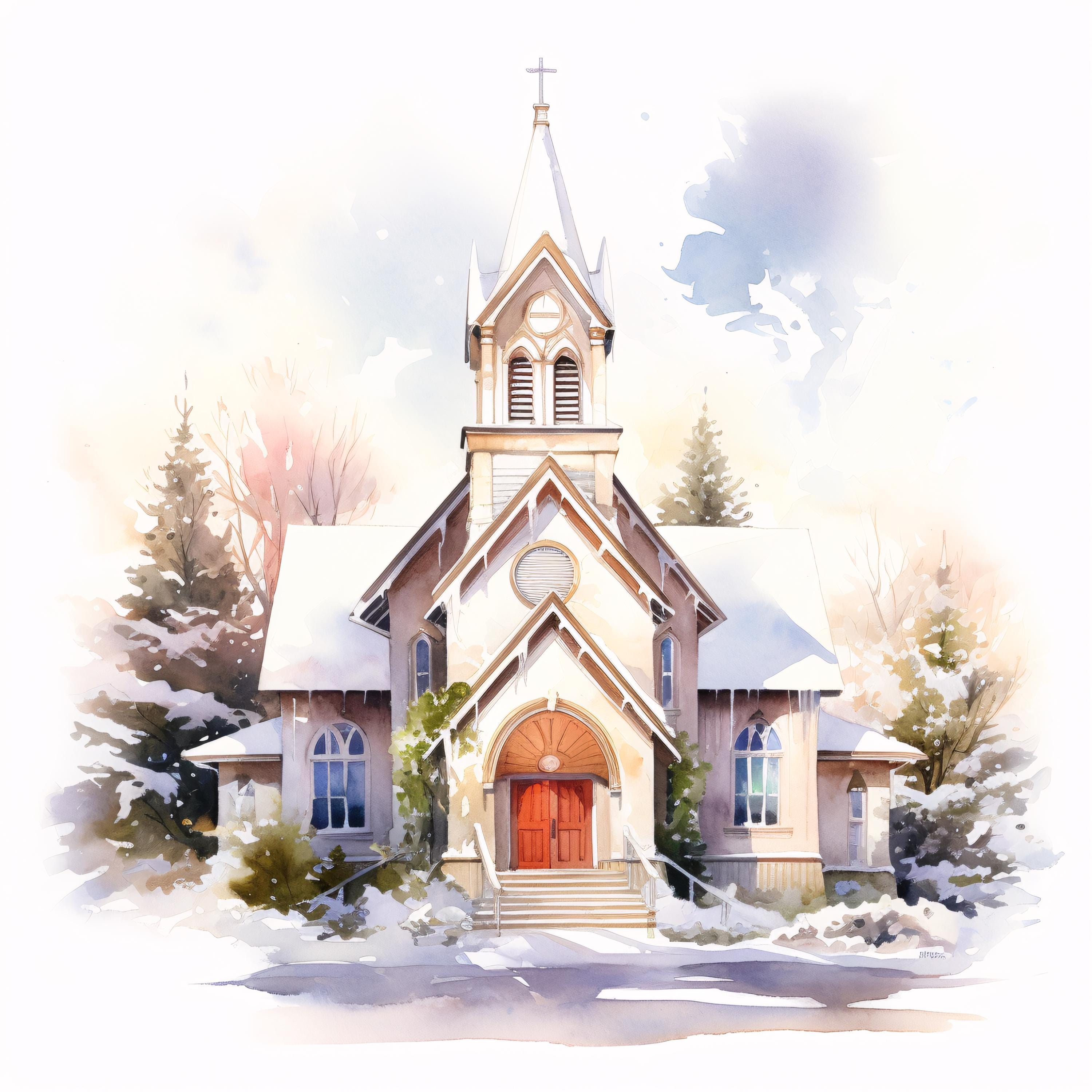 Winter Church Clipart, Snowy Chapel Images, 10 Watercolor Clip Art, Printable JPGs, Instant Download, Commercial Use, Paper Craft