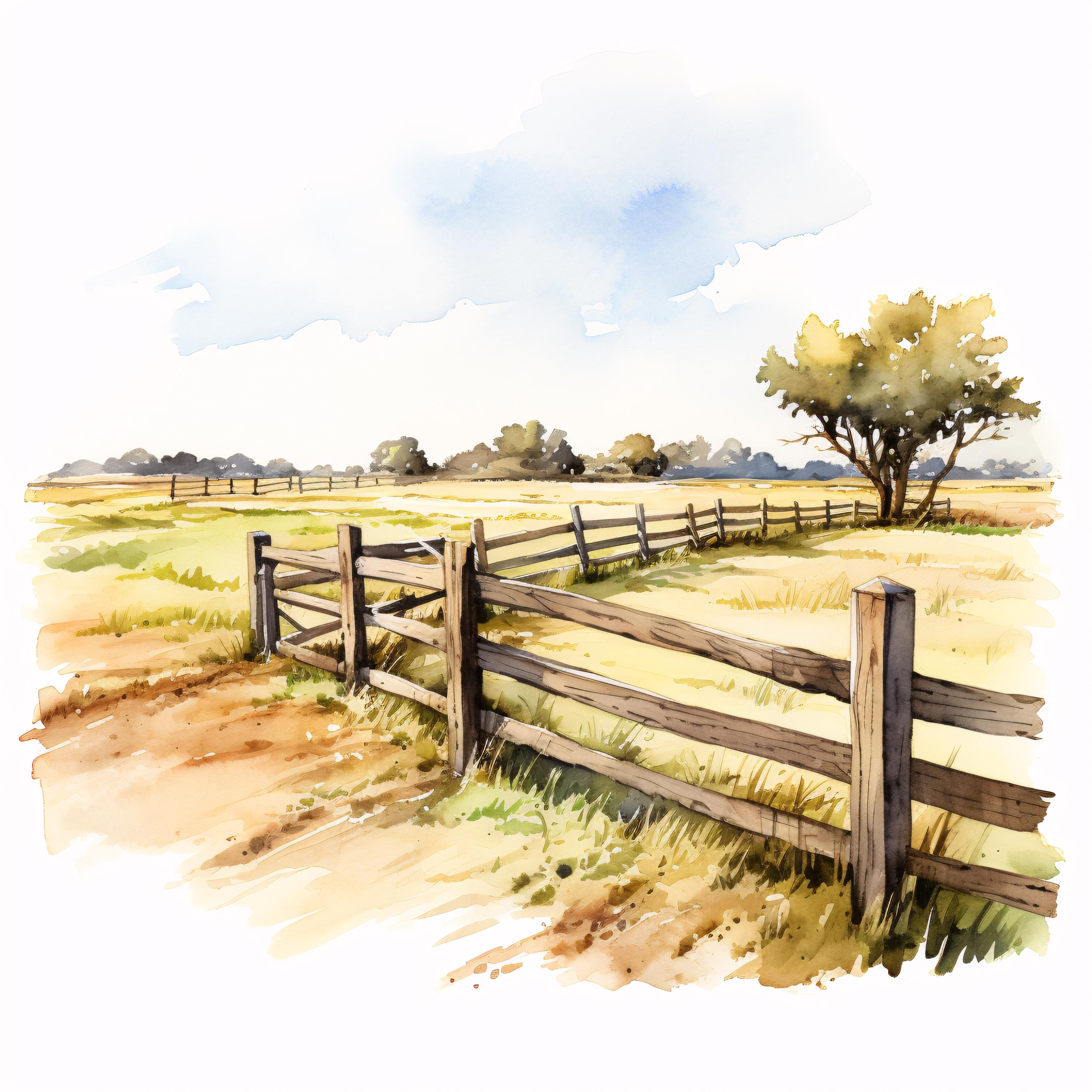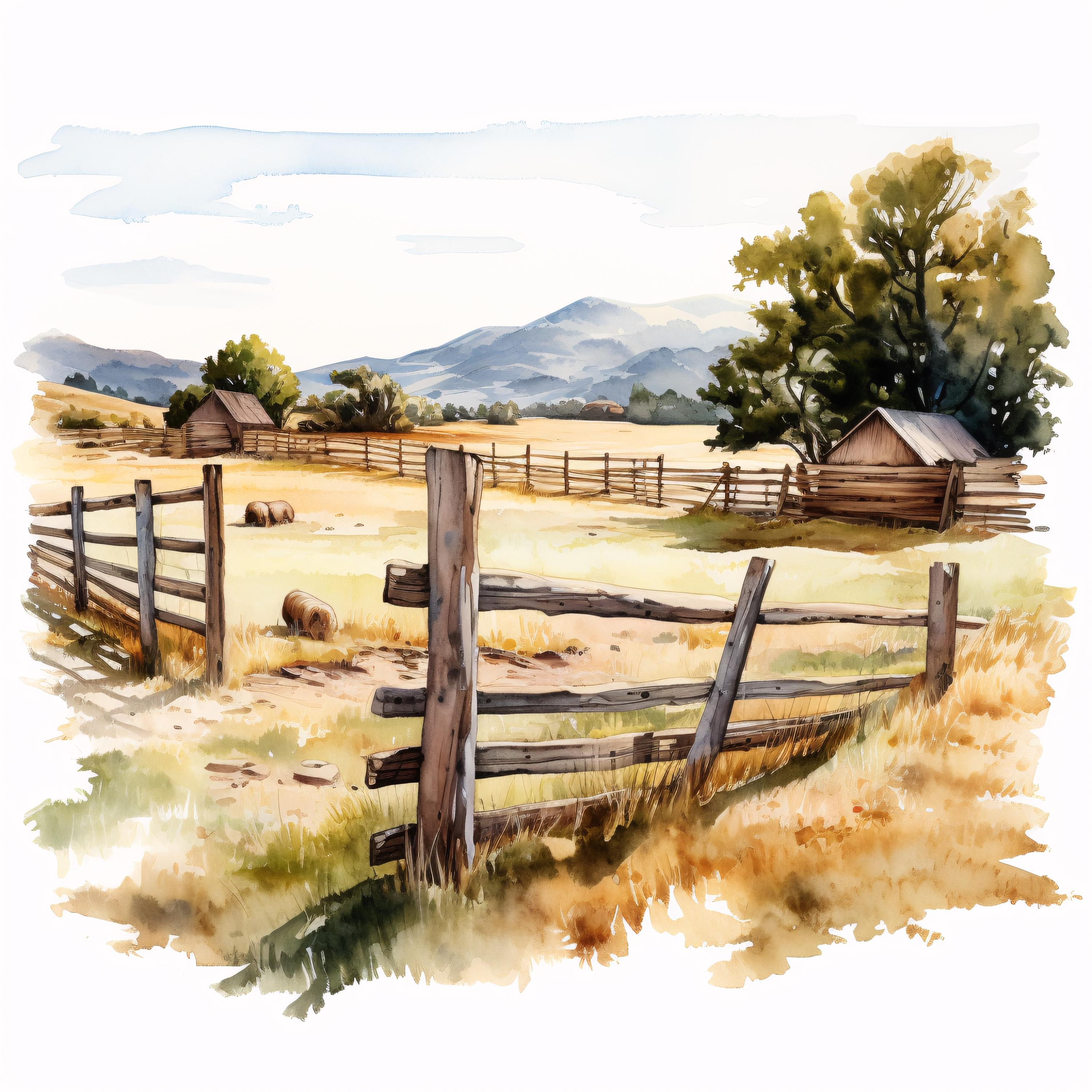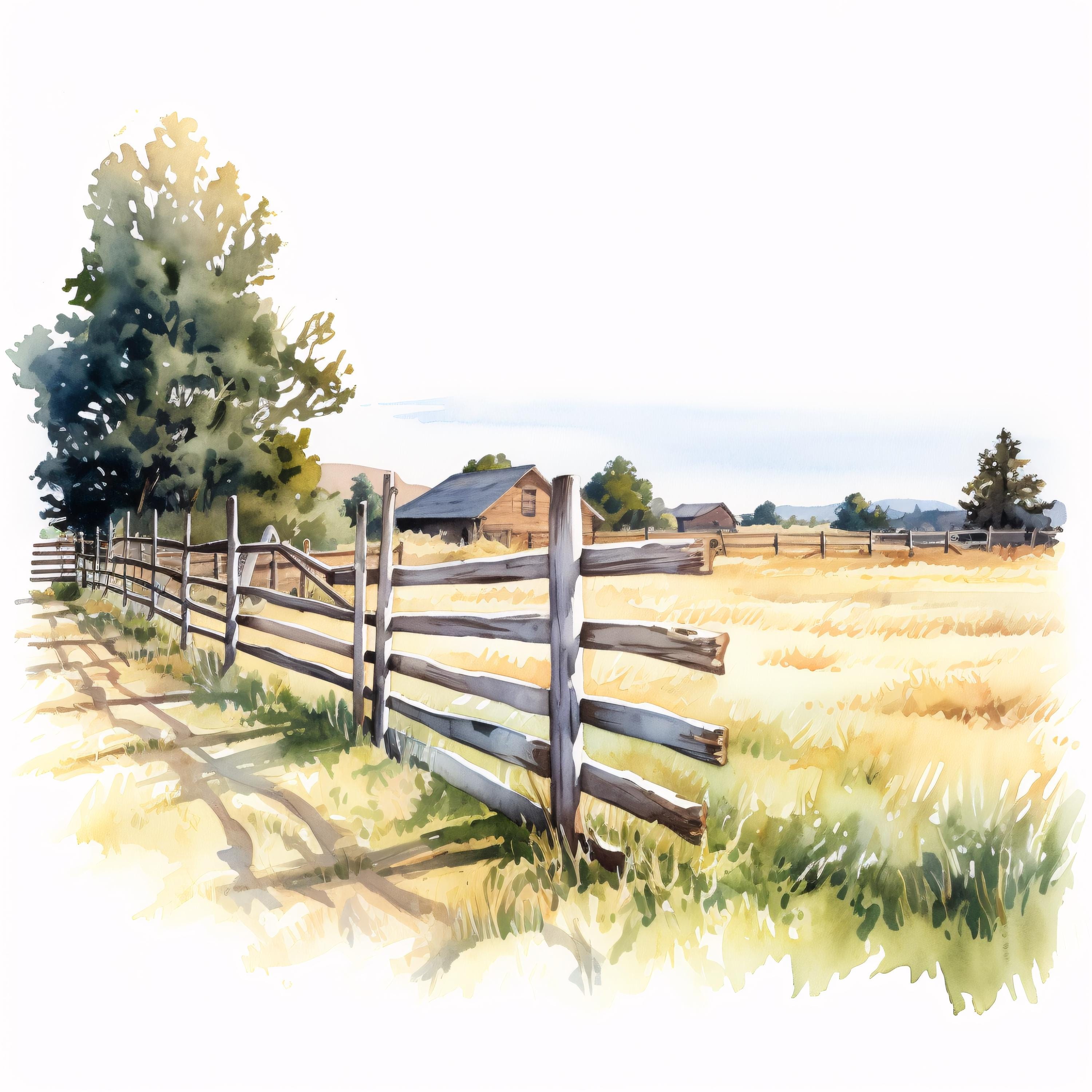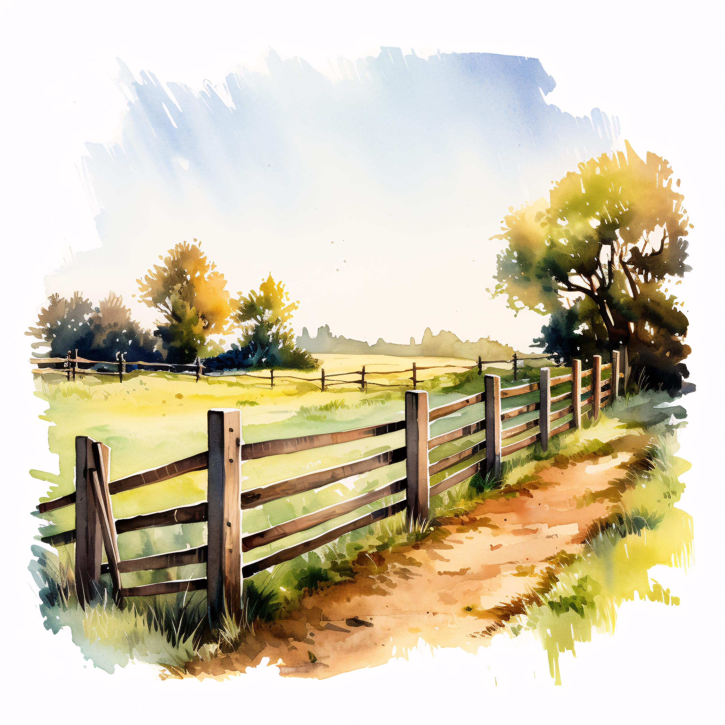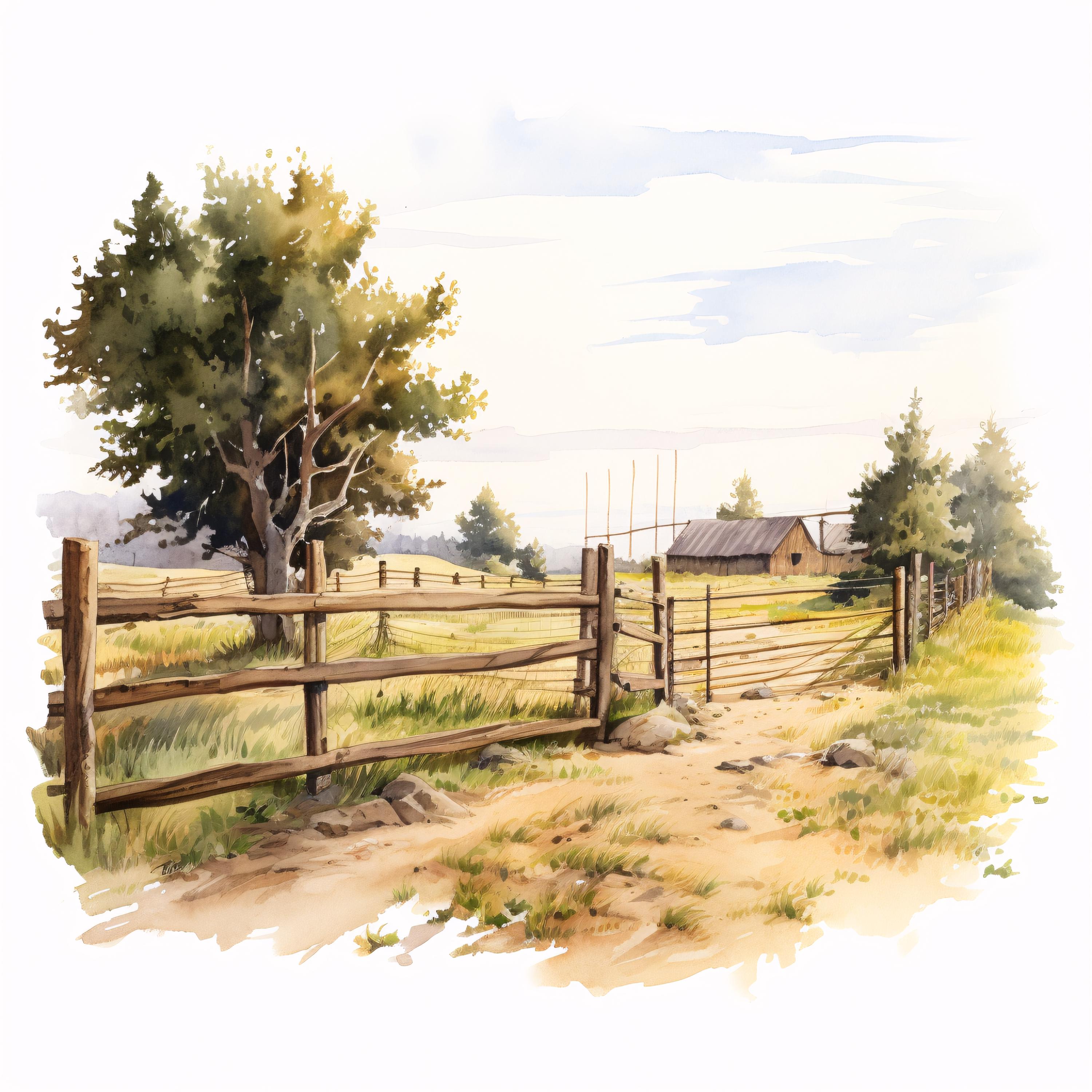 Farm Fence Clipart, Countryside Field Images, 10 Watercolor Clip Art, Printable JPGs, Instant Download, Commercial Use, Paper Craft