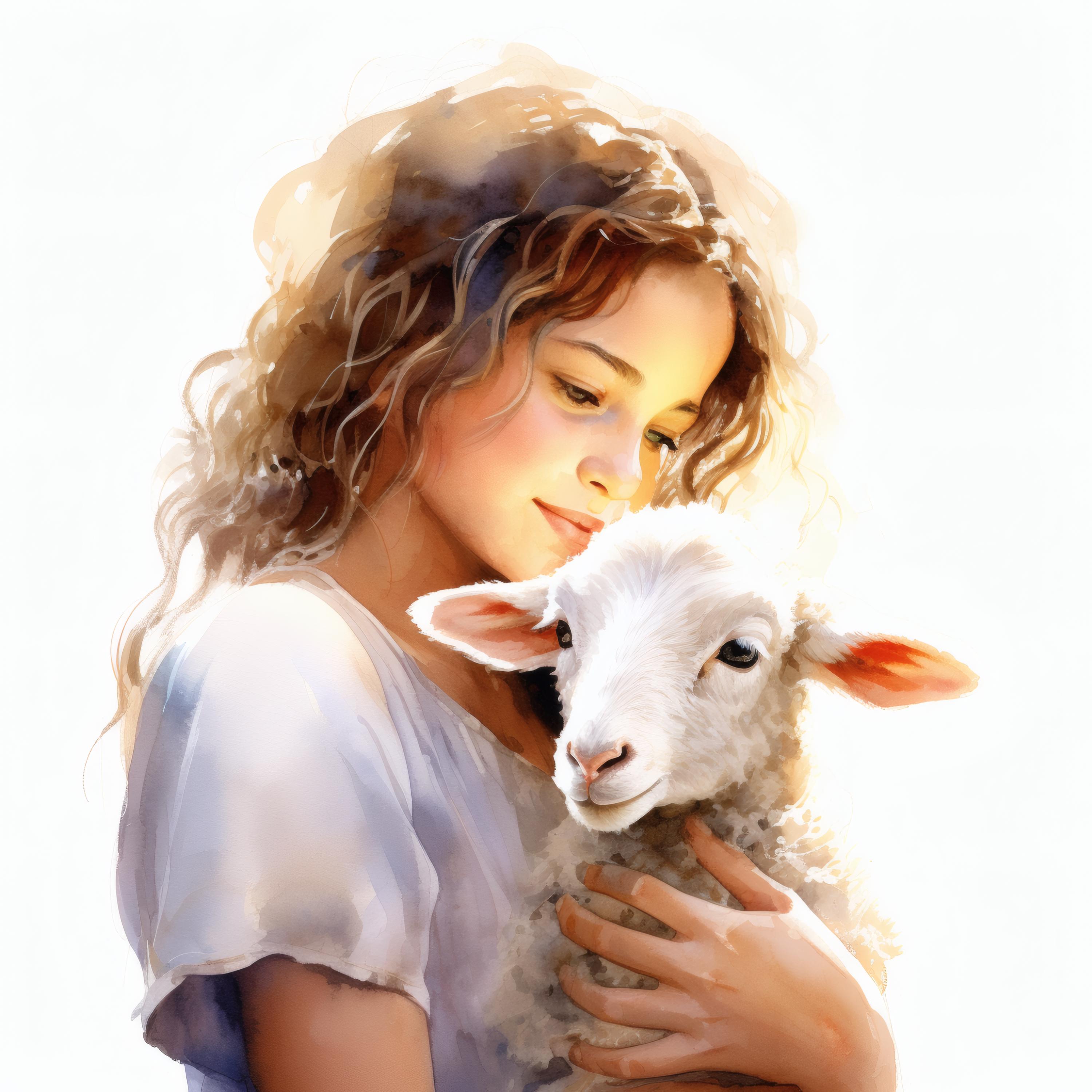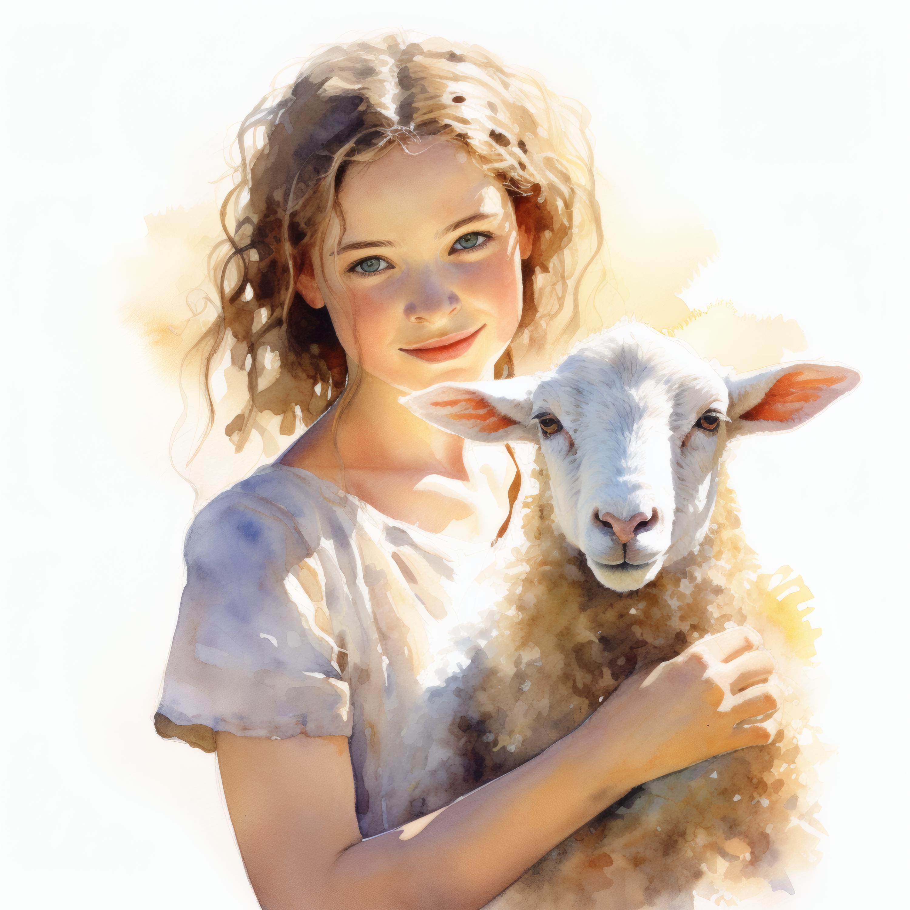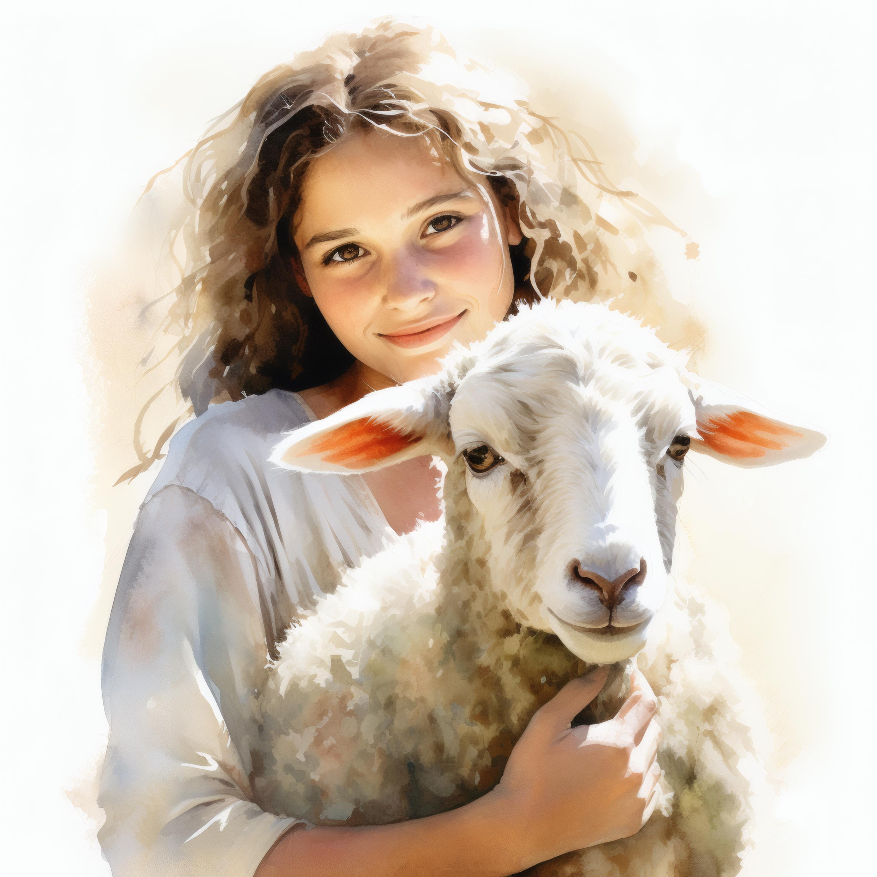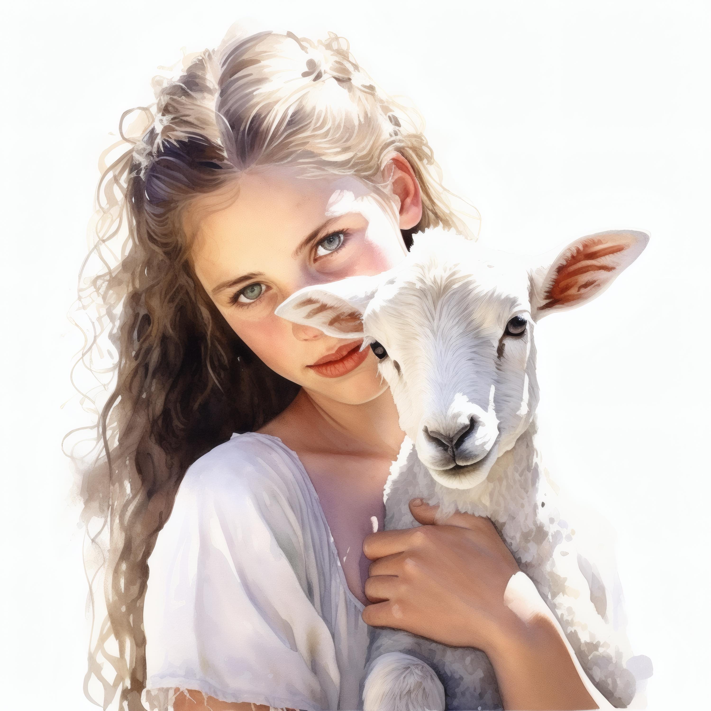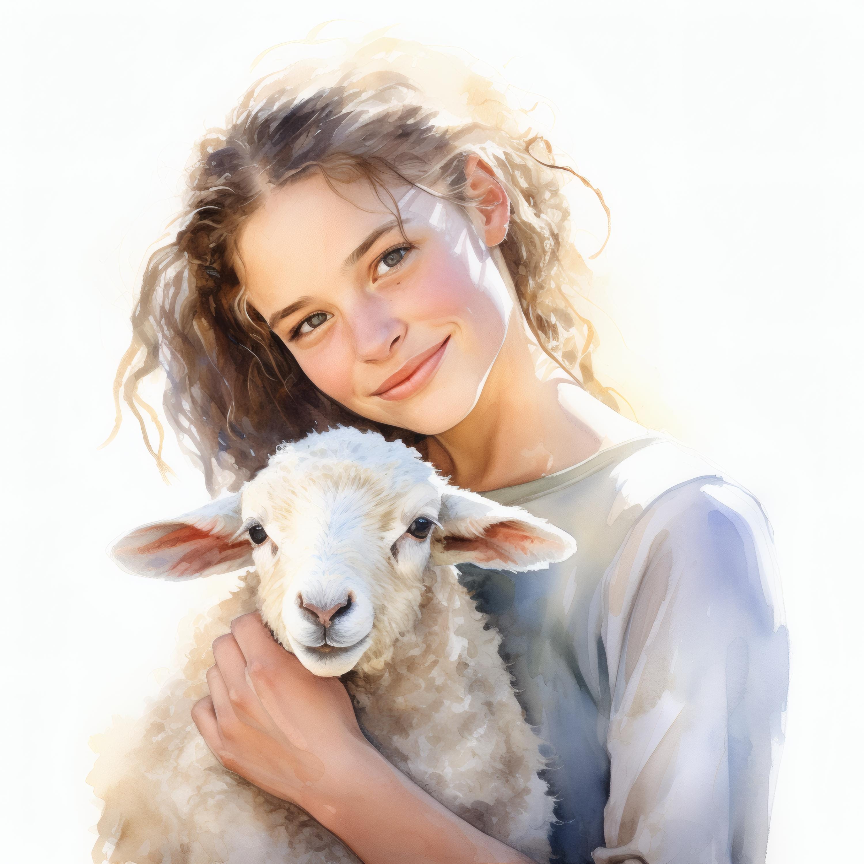 Girl and Lamb Clipart, Pastoral Scene Images, 10 Watercolor Clip Art, Printable JPGs, Instant Download, Commercial Use, Paper Craft