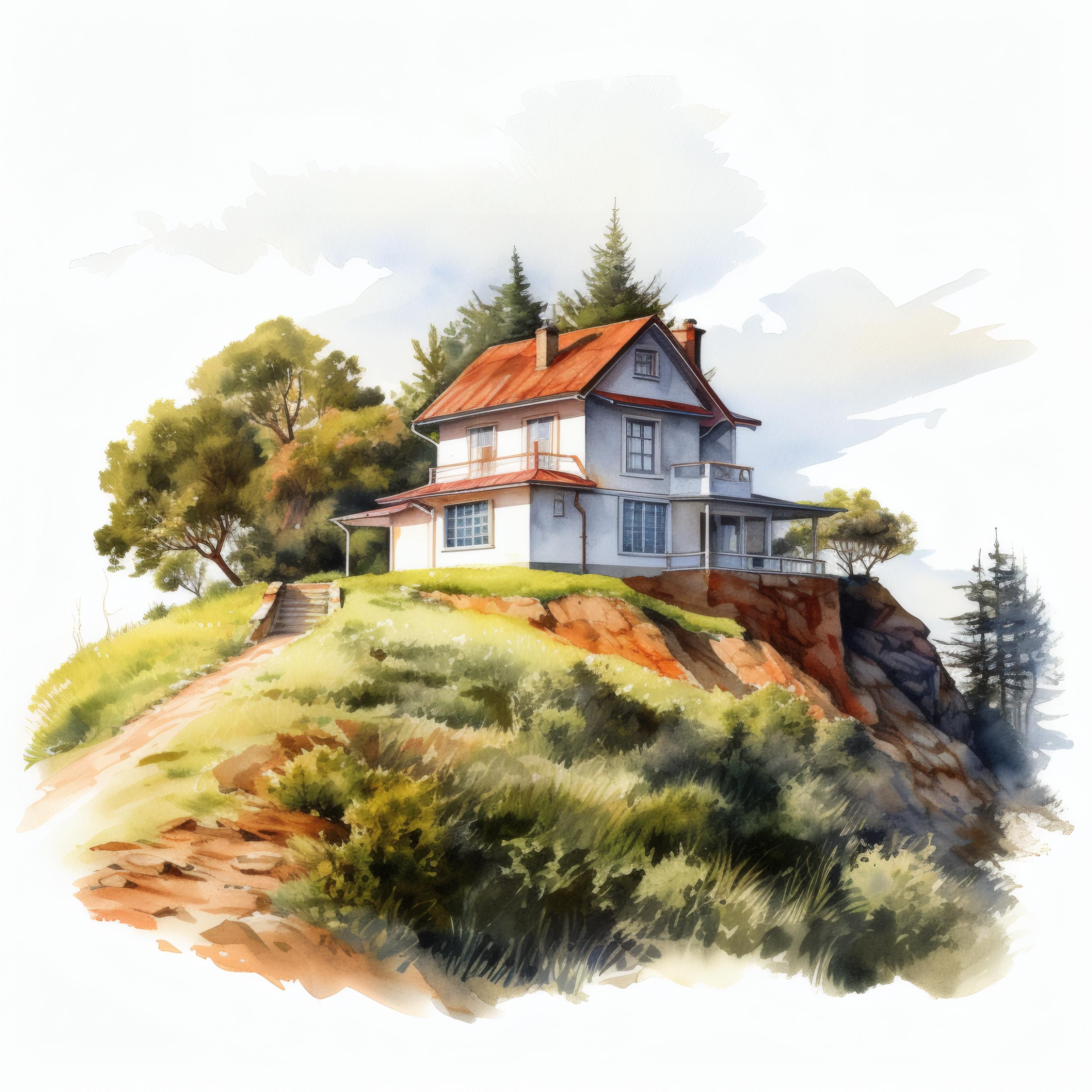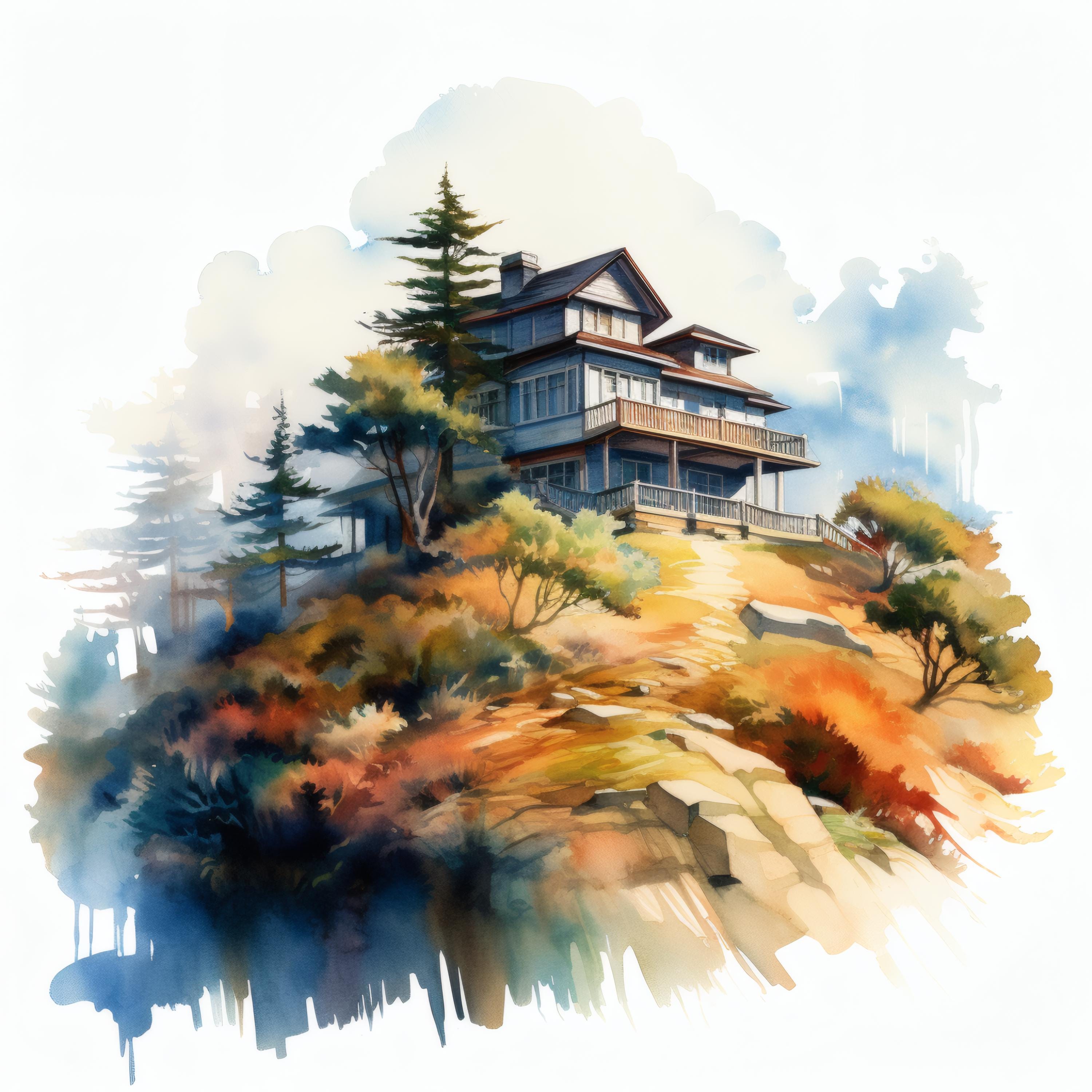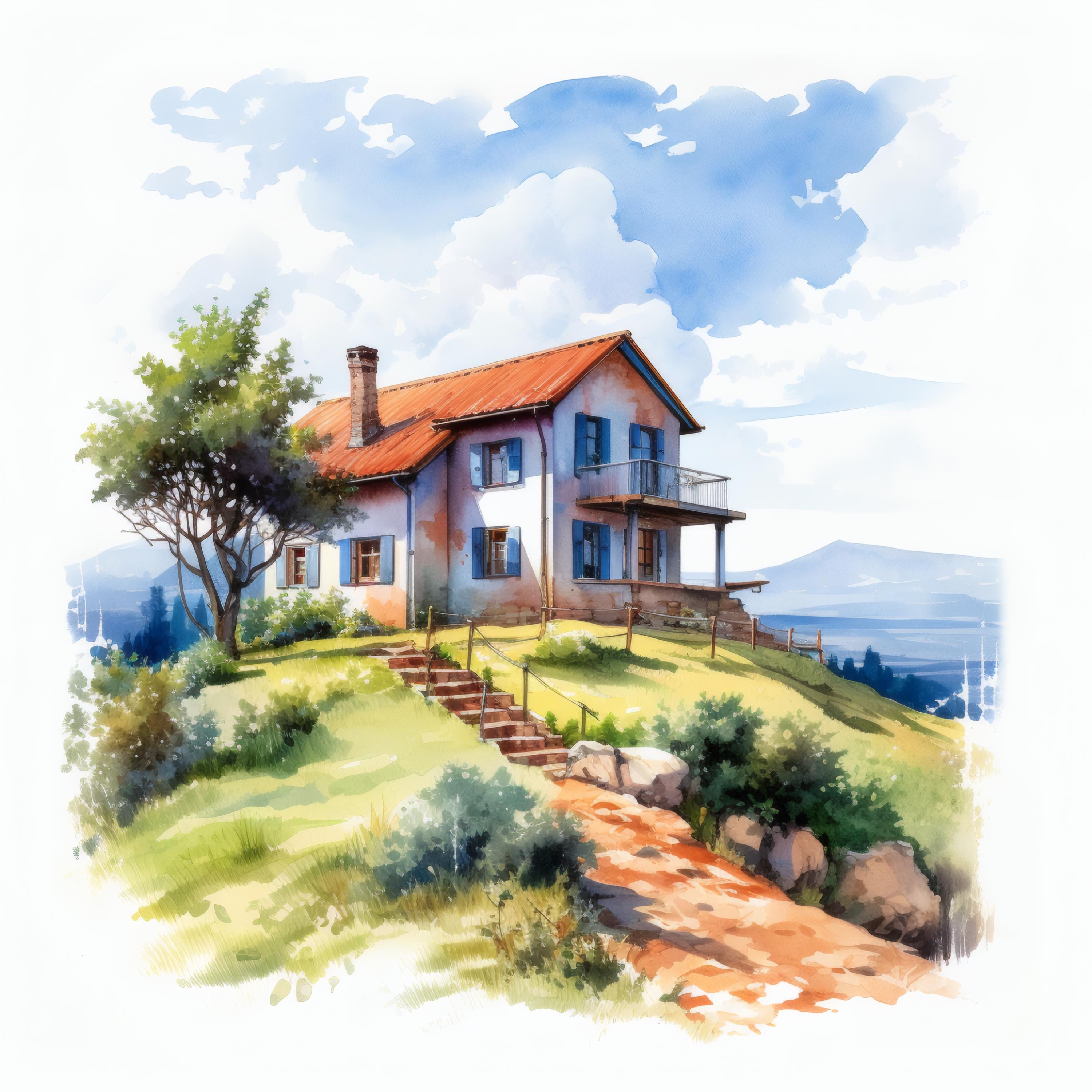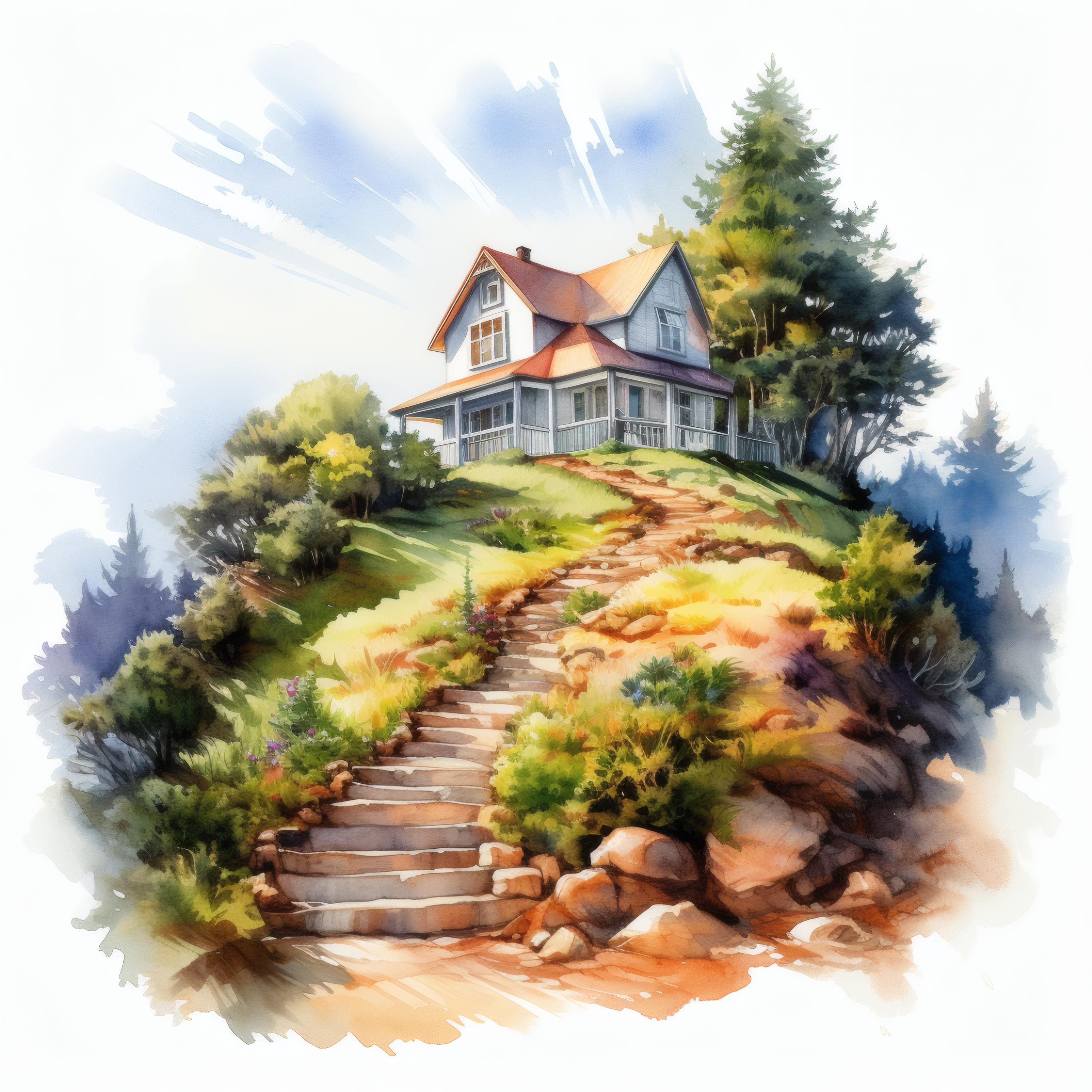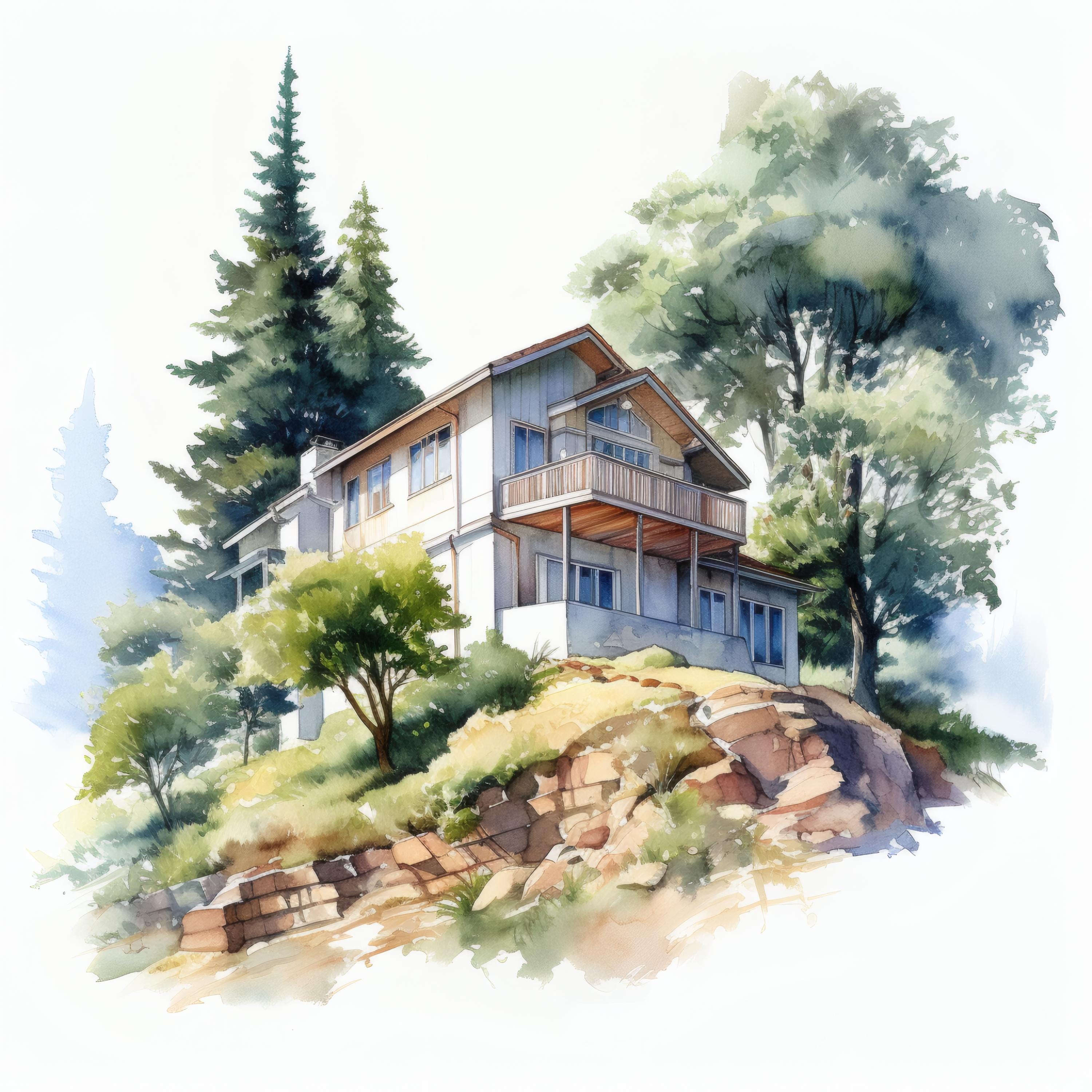 Hilltop House Clipart, Mountain Home Images, 10 Watercolor Clip Art, Printable JPGs, Instant Download, Commercial Use, Paper Craft