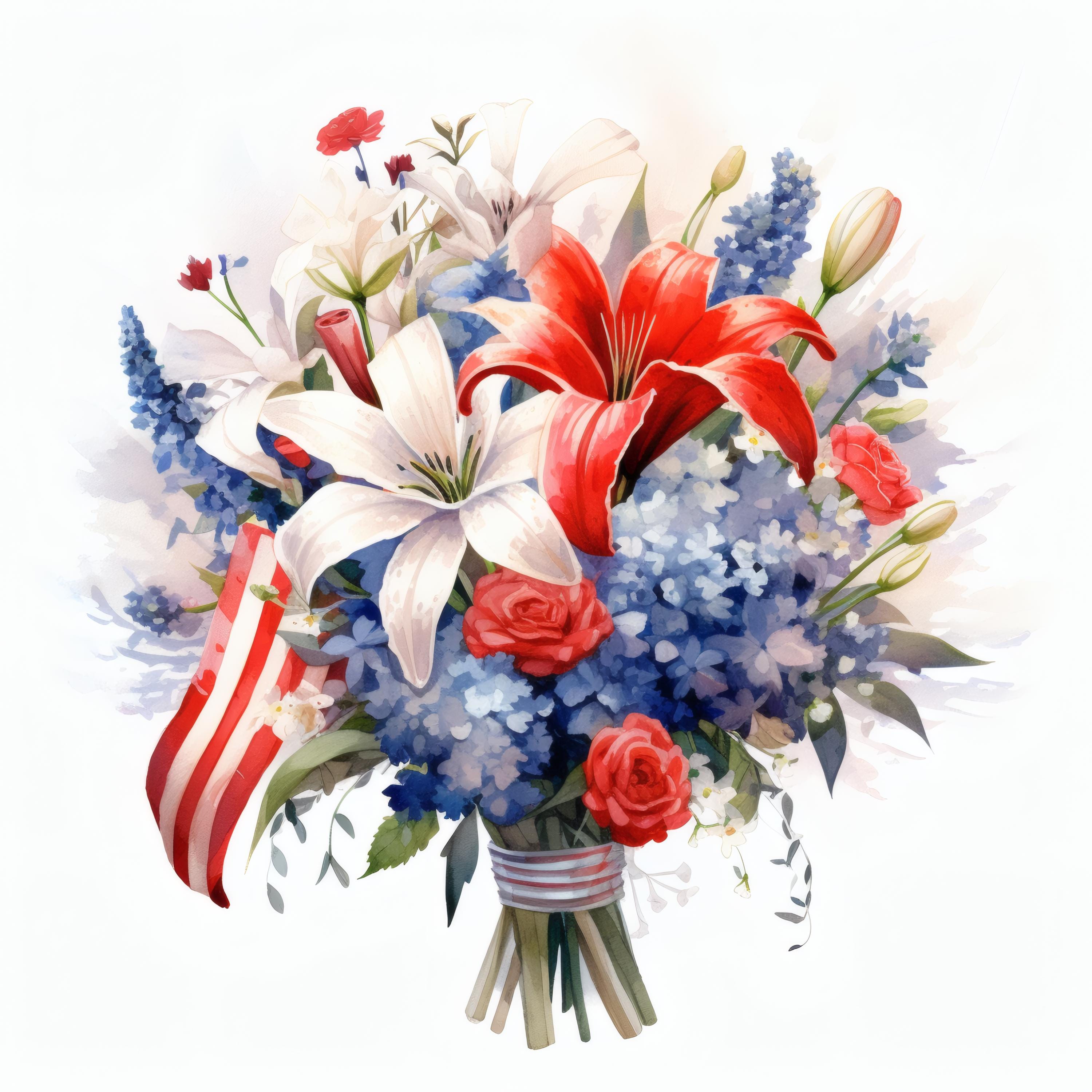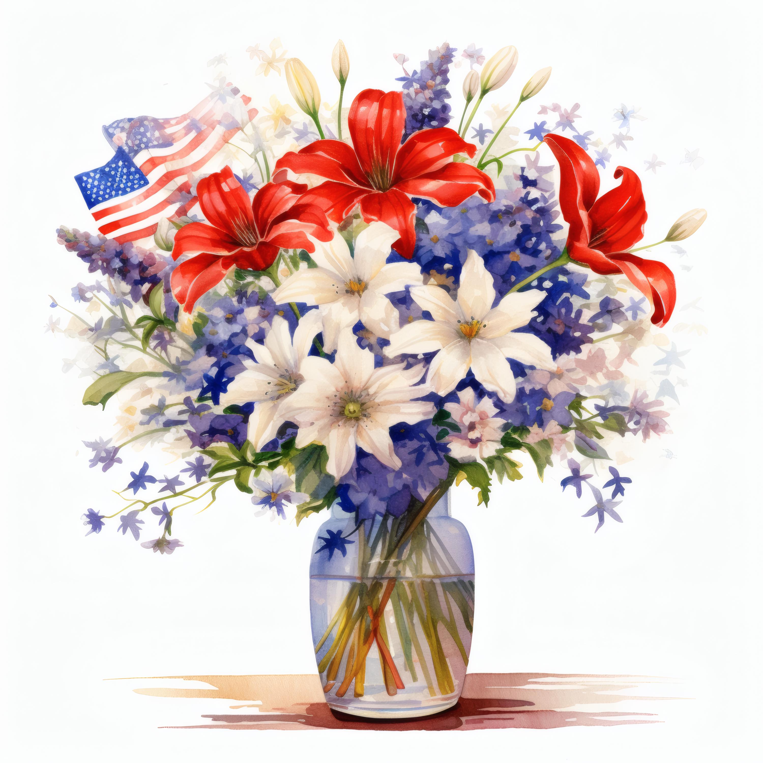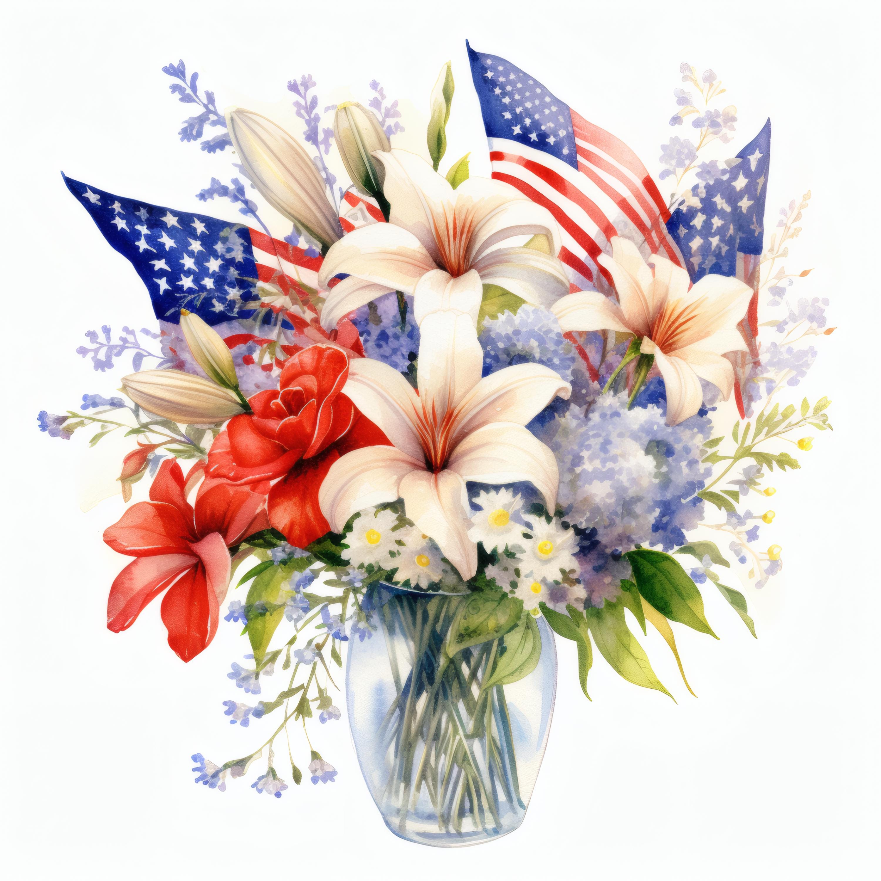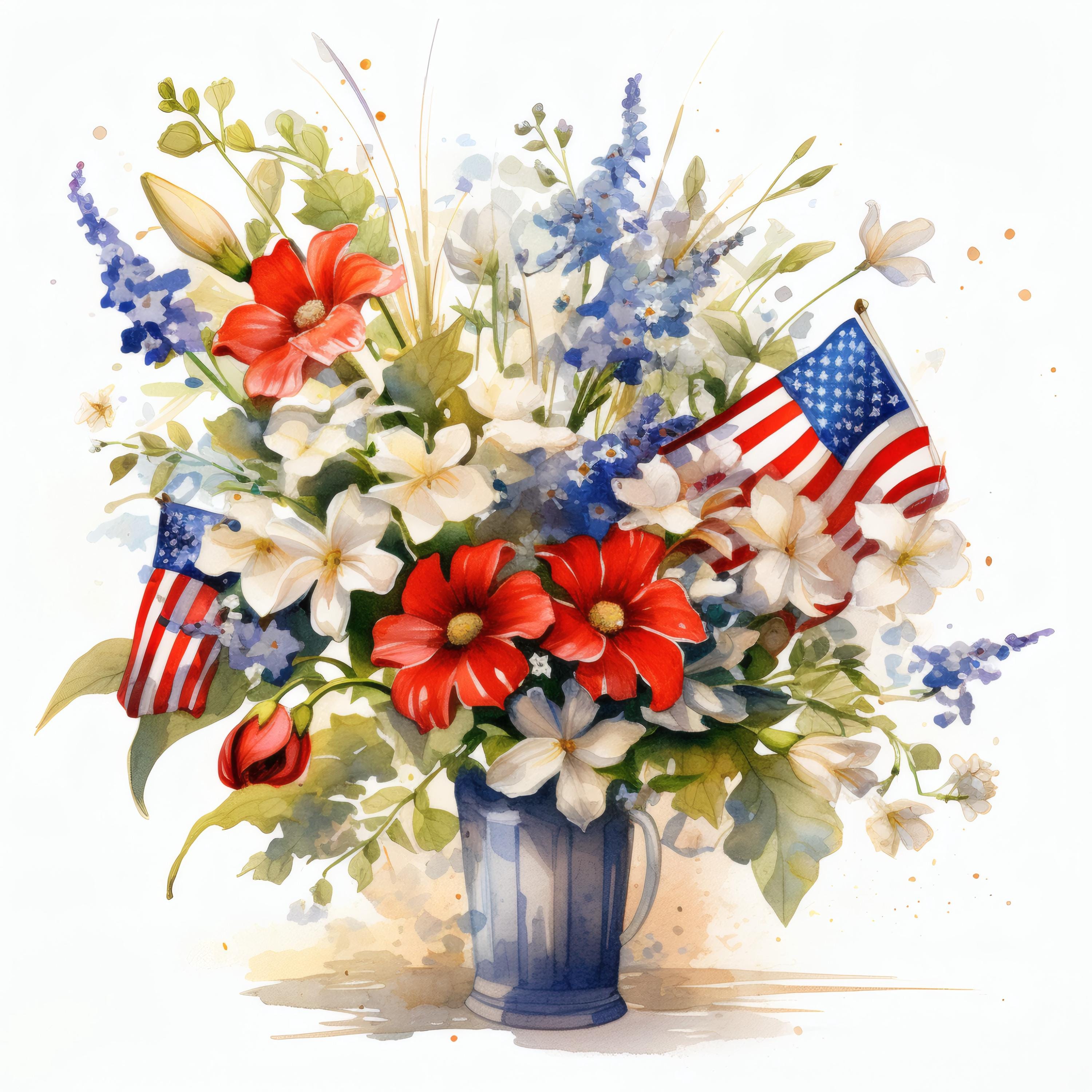 Patriotic Flower Bouquet Clipart, Red White Blue Floral Images, 10 Watercolor Clip Art, Printable JPGs, Instant Download, Commercial Use
