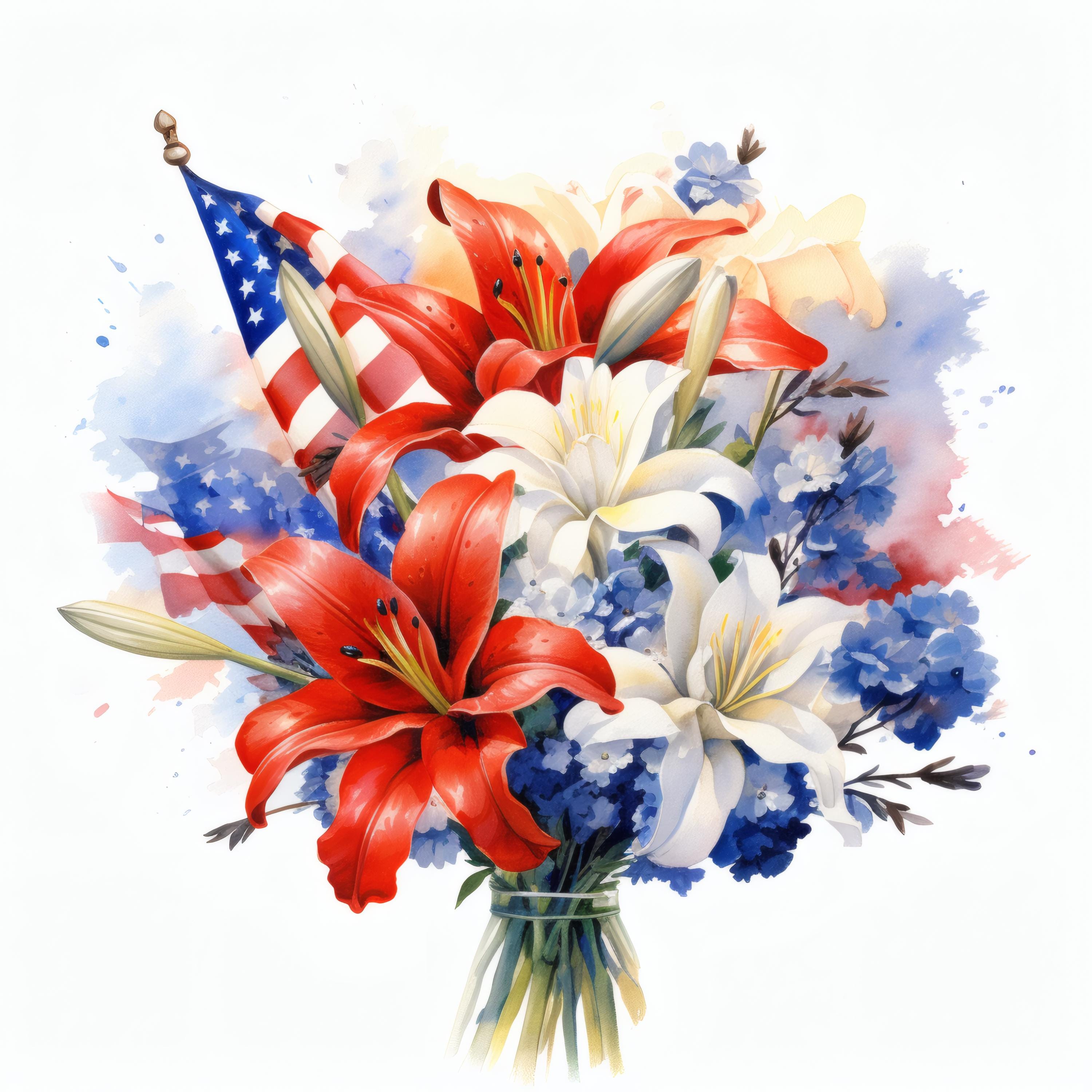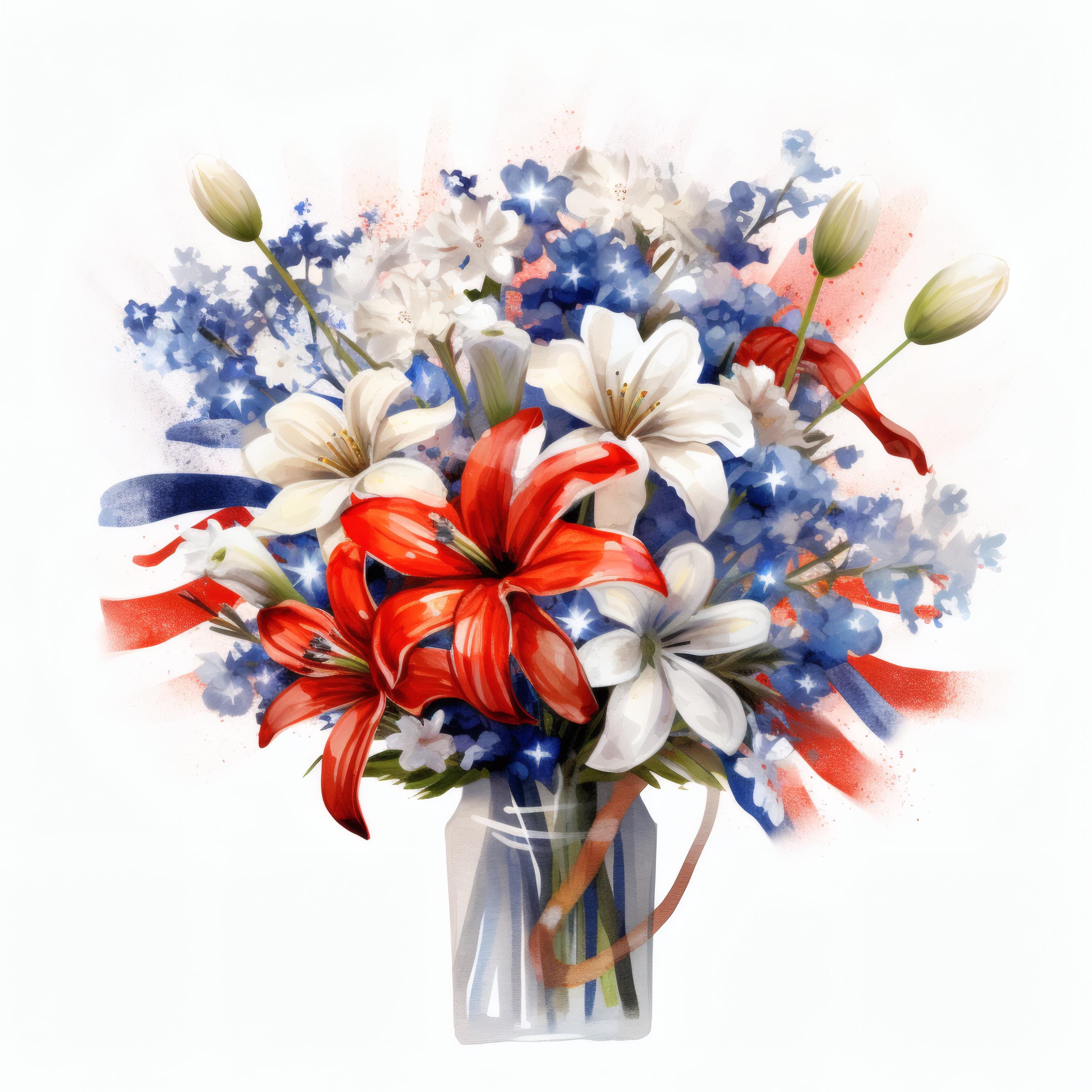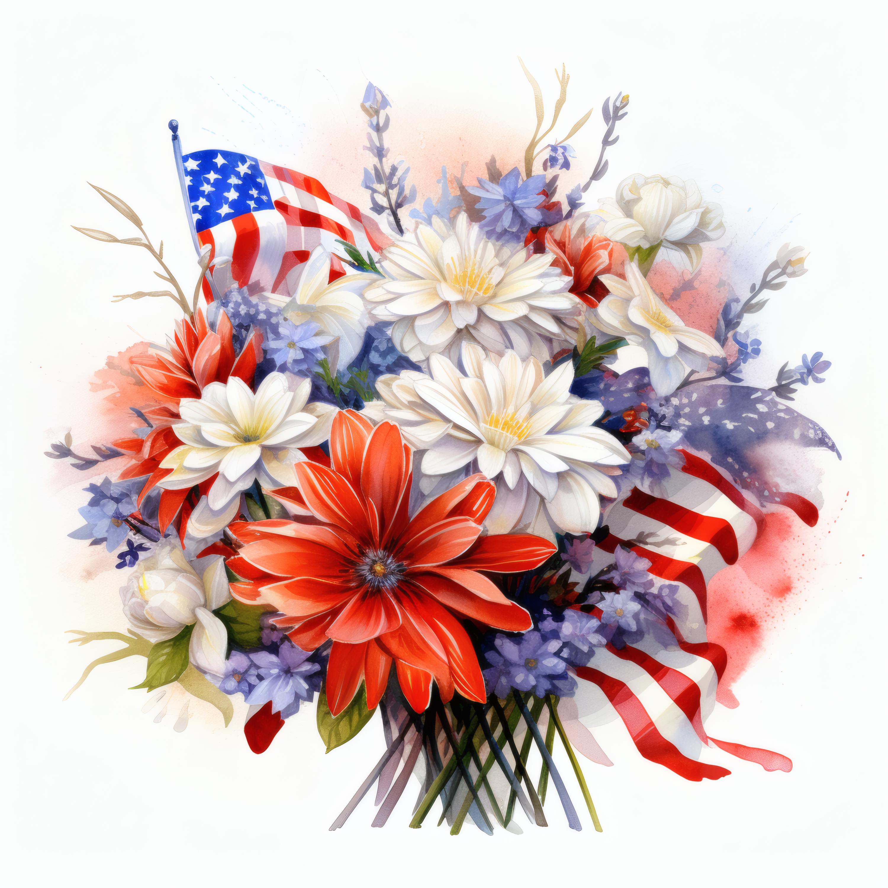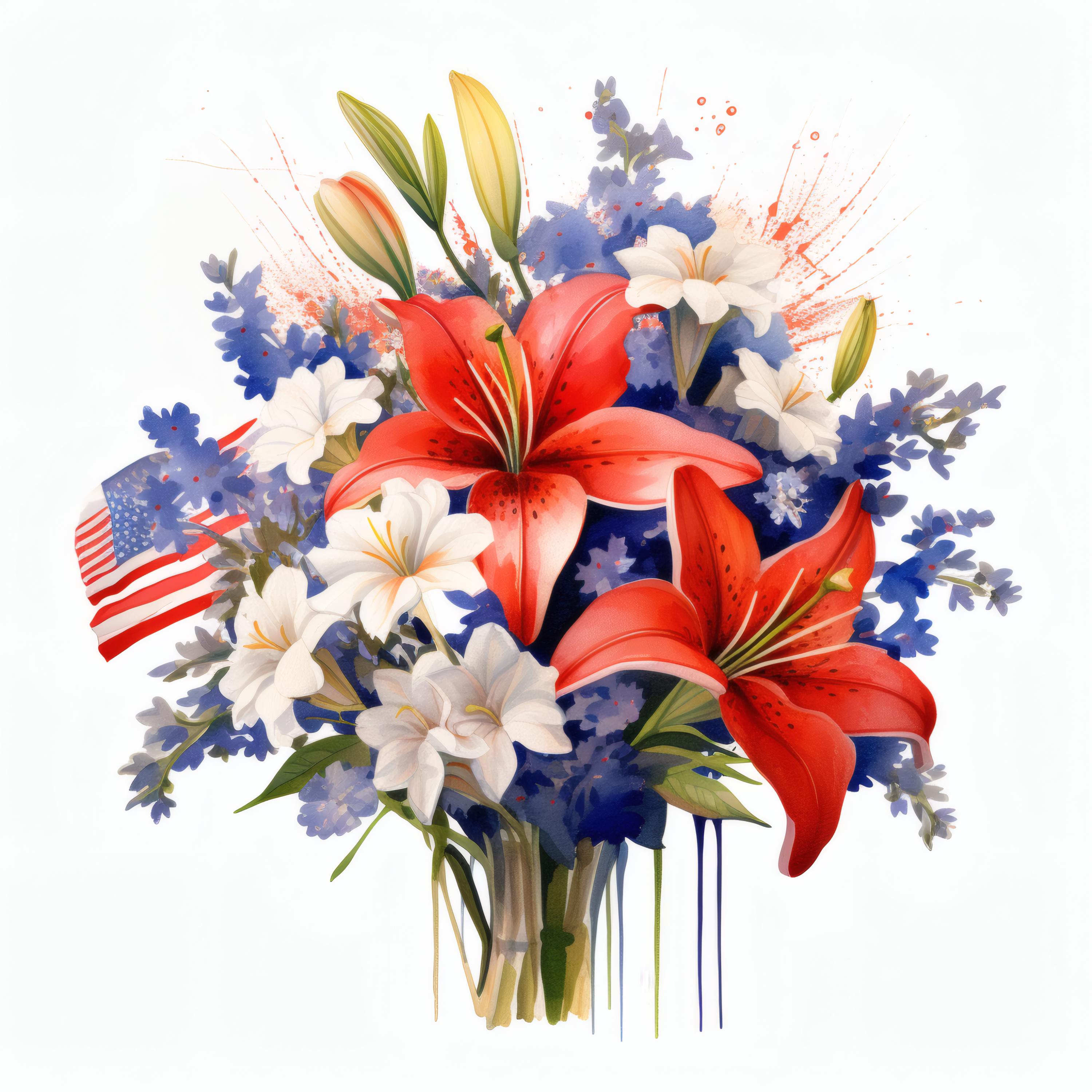 Patriotic Flower Bouquet Clipart, Red White Blue Floral Images, 10 Watercolor Clip Art, Printable JPGs, Instant Download, Commercial Use