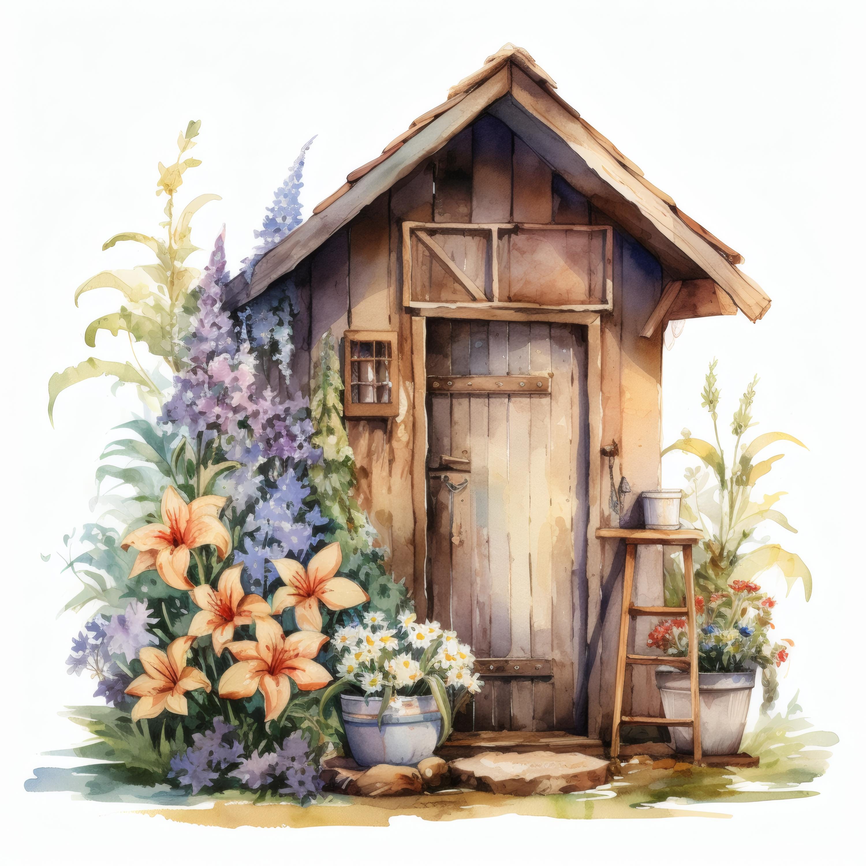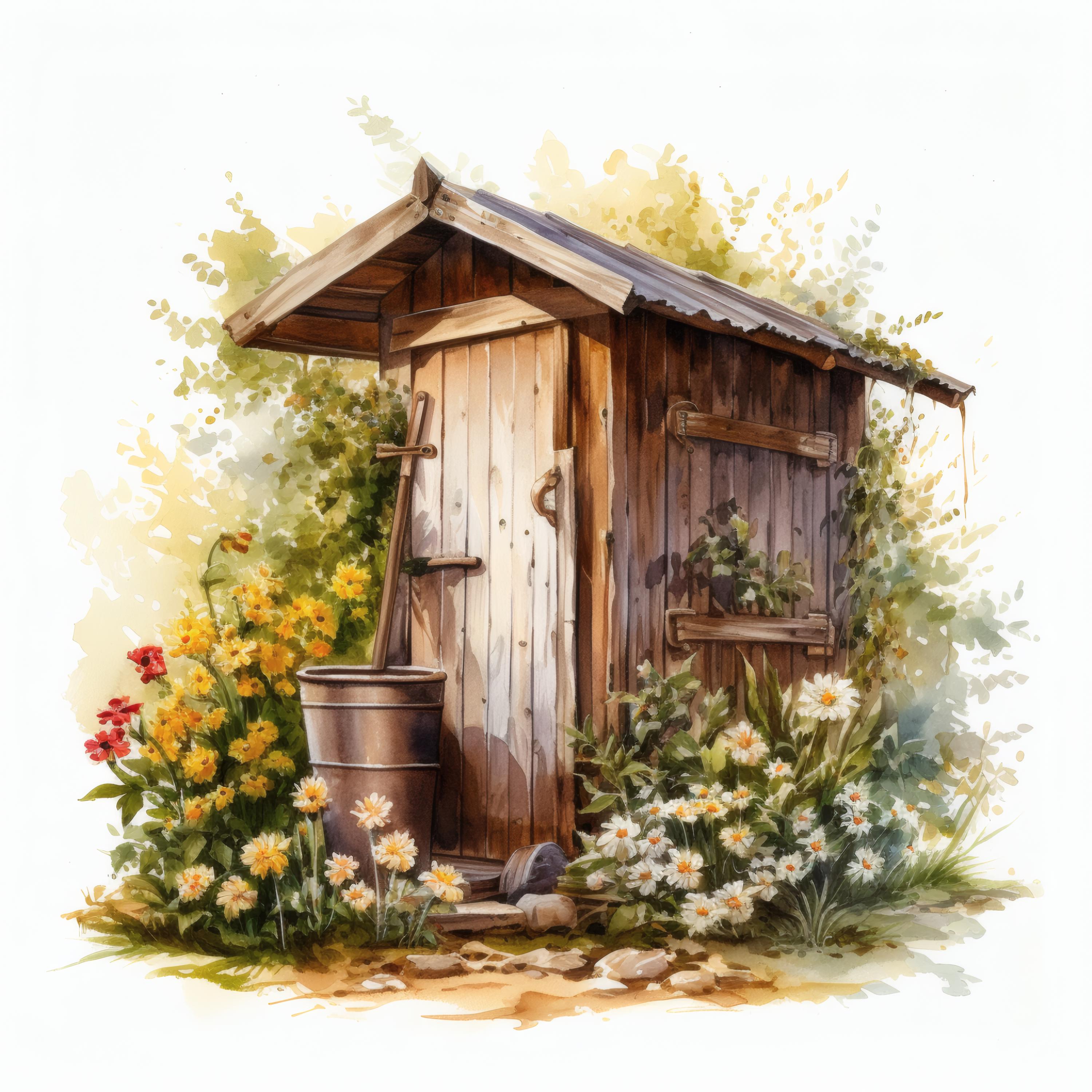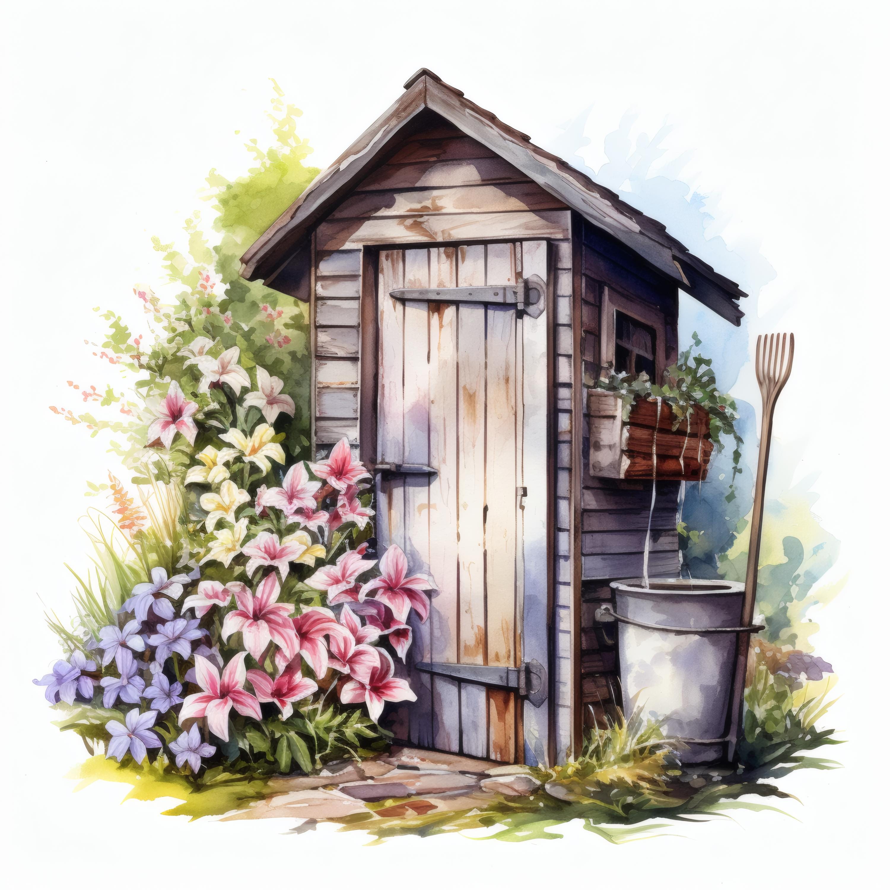 Rustic Outhouse Clipart, Country Garden Images, 10 Watercolor Clip Art, Printable JPGs, Instant Download, Commercial Use, Paper craft