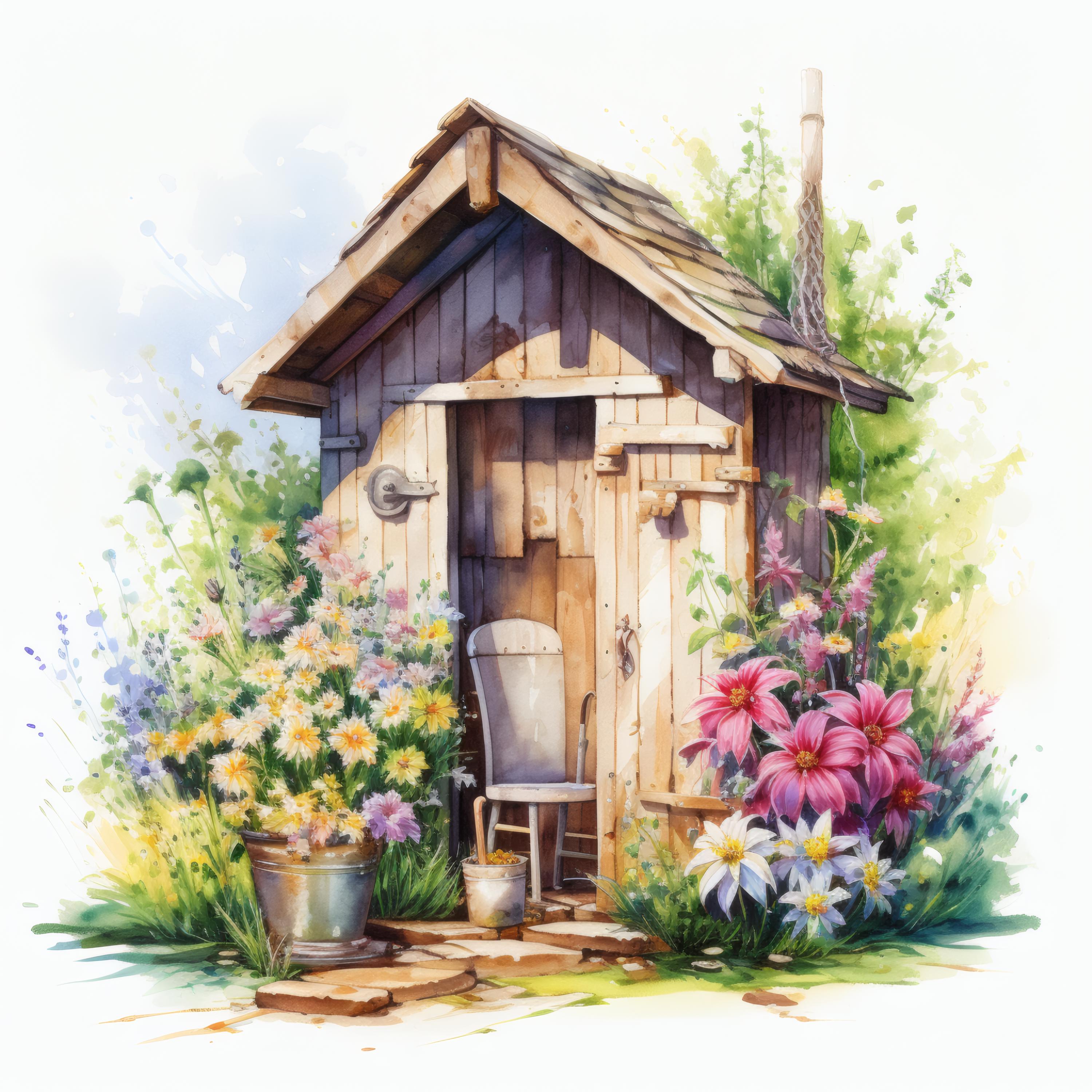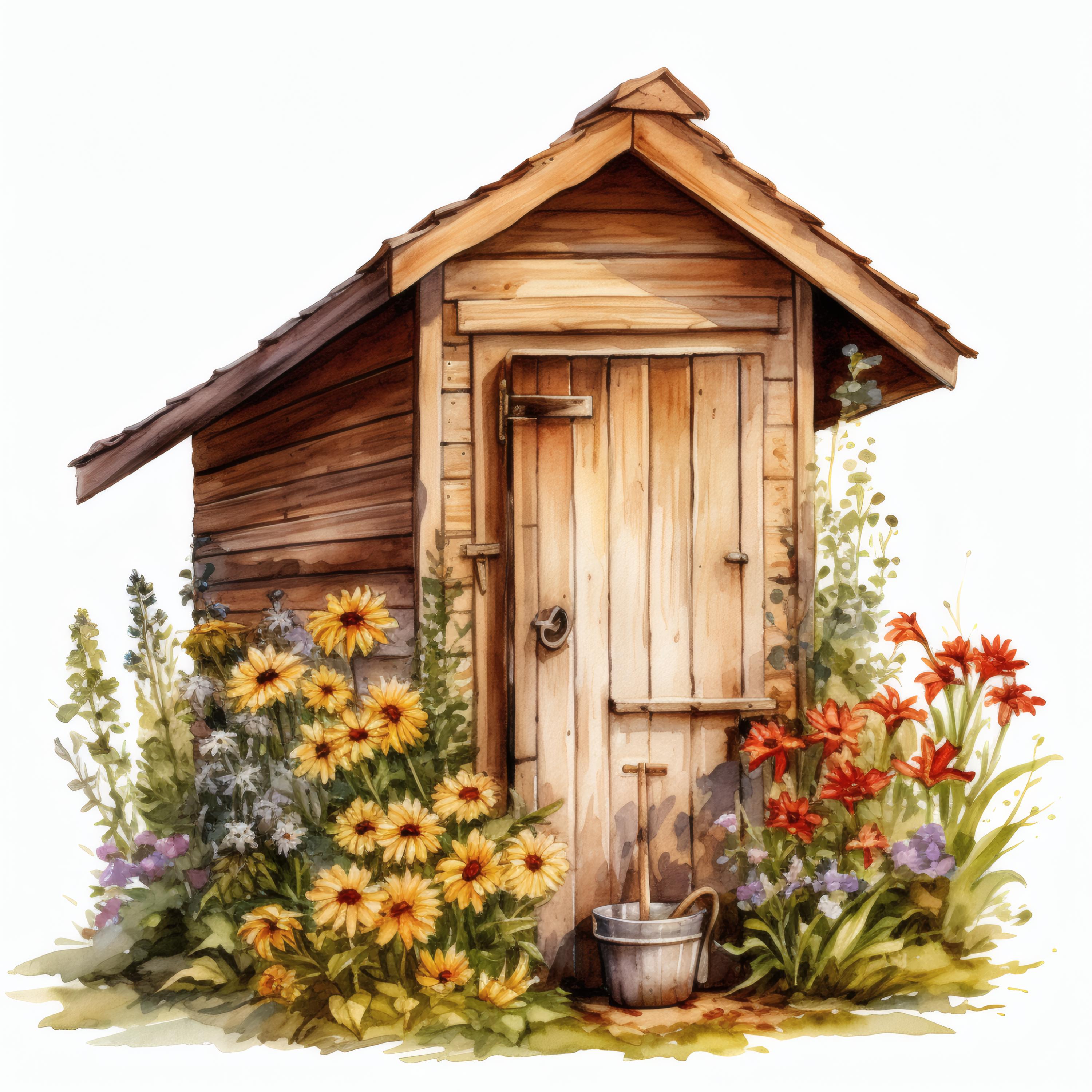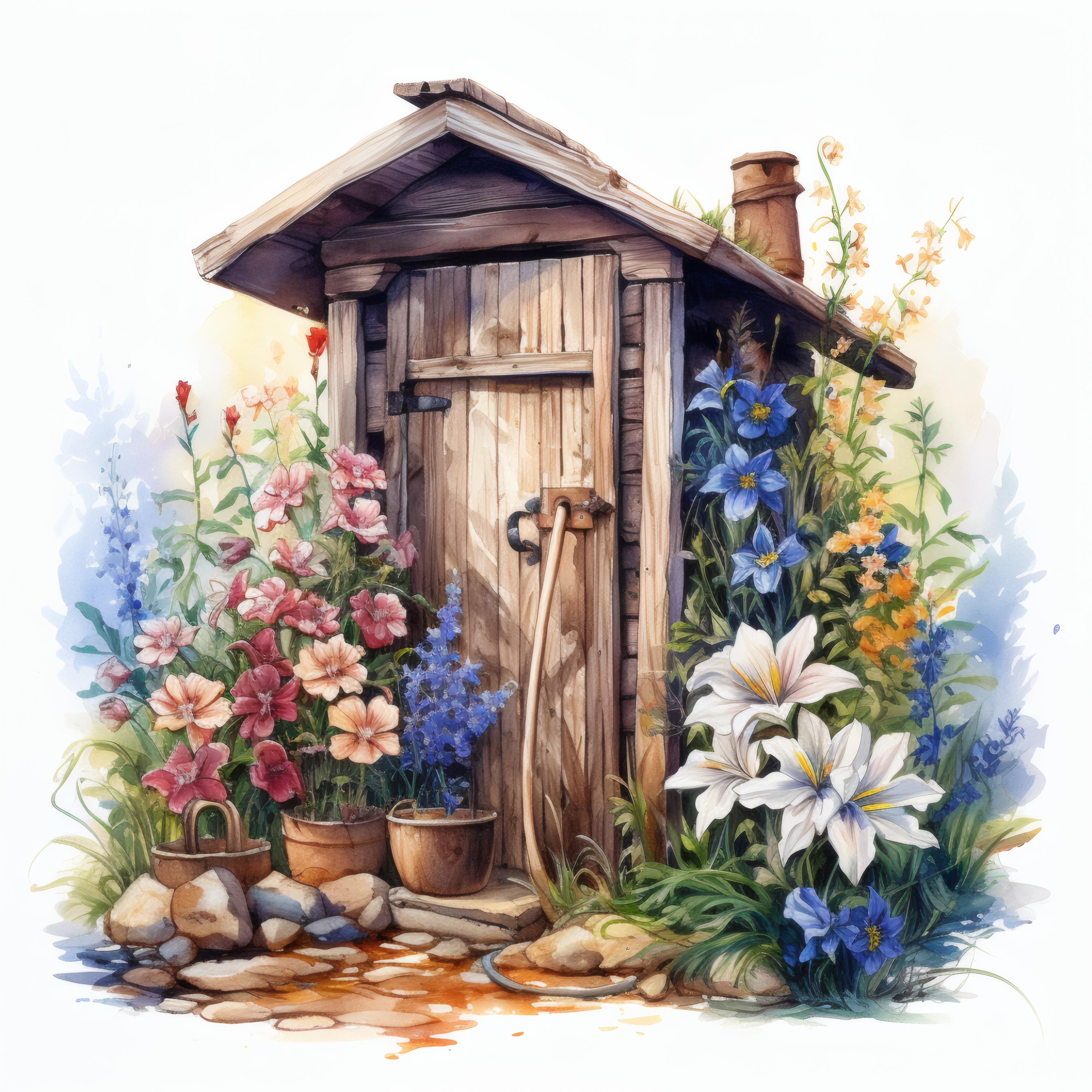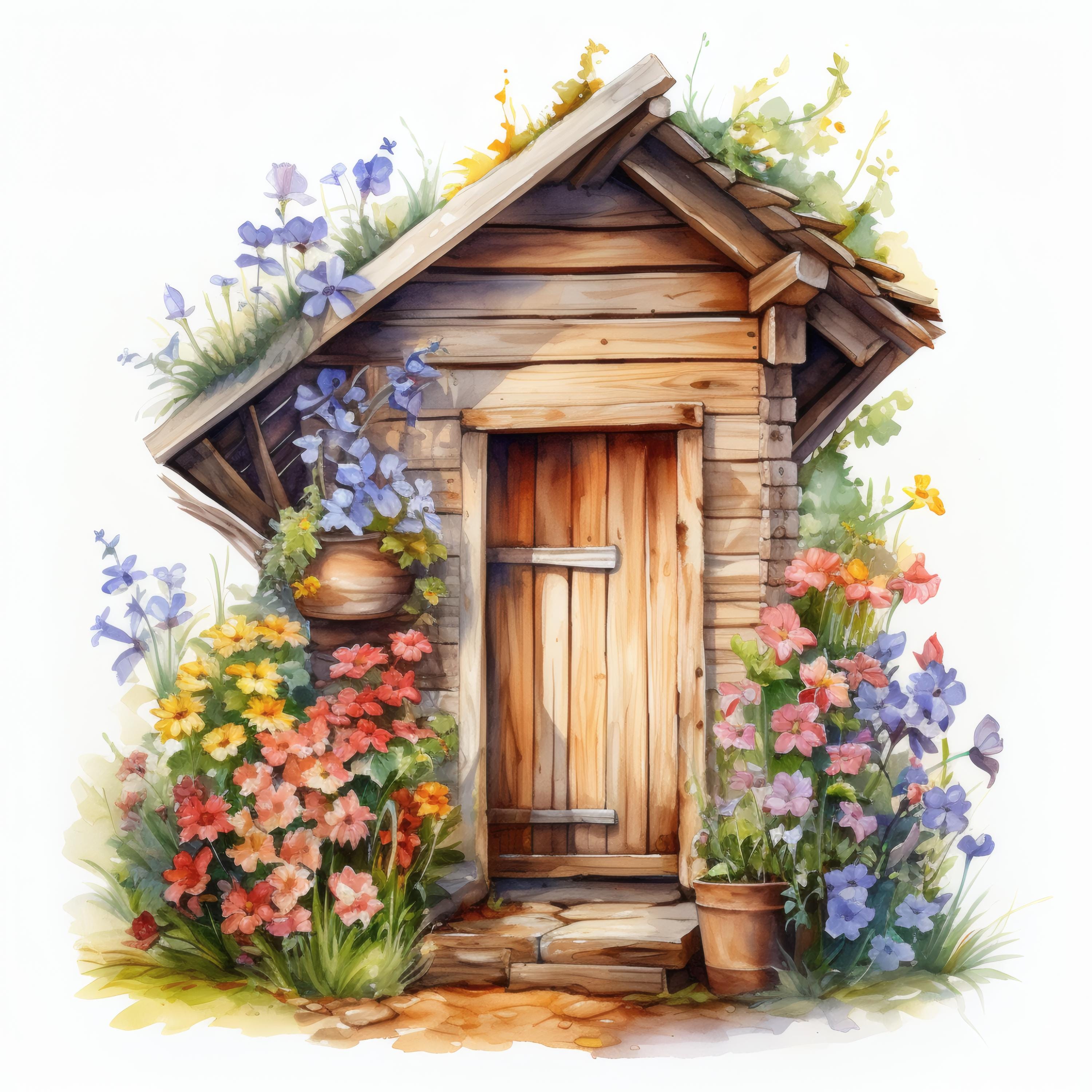 Rustic Outhouse Clipart, Country Garden Images, 10 Watercolor Clip Art, Printable JPGs, Instant Download, Commercial Use, Paper craft