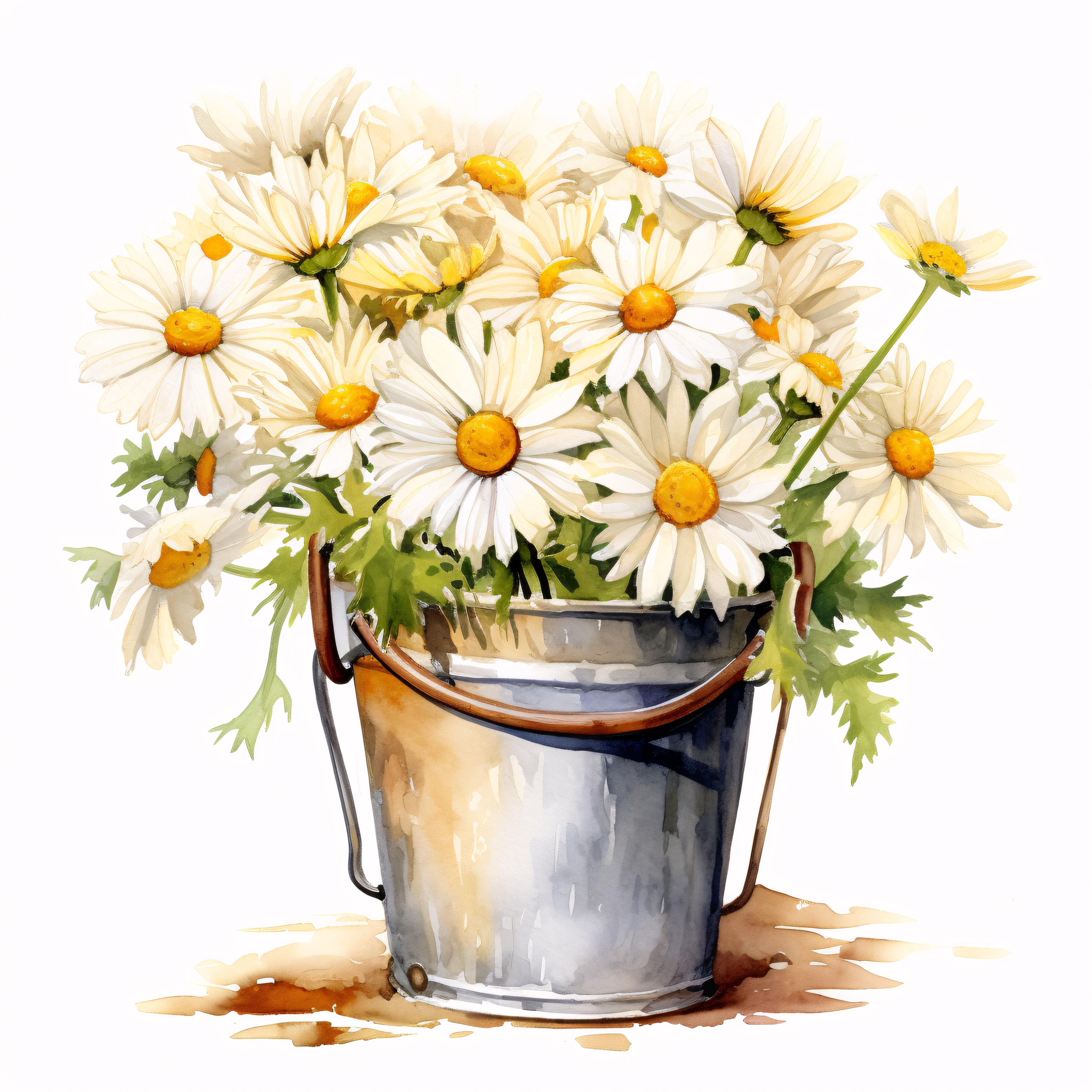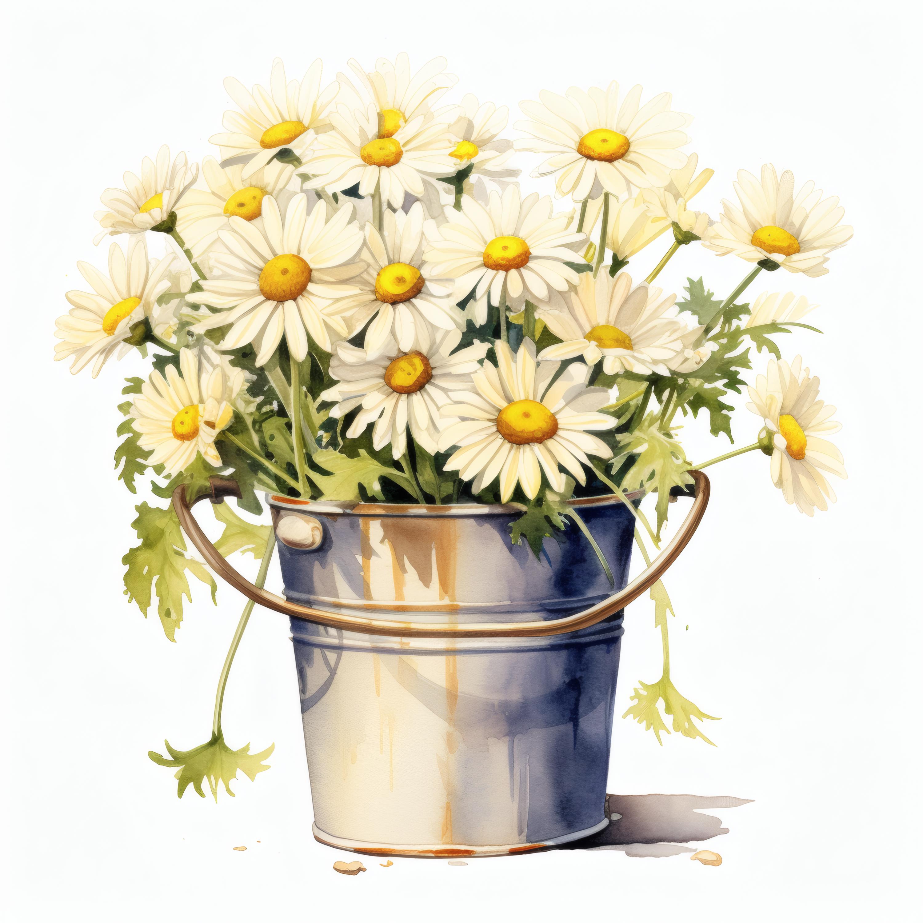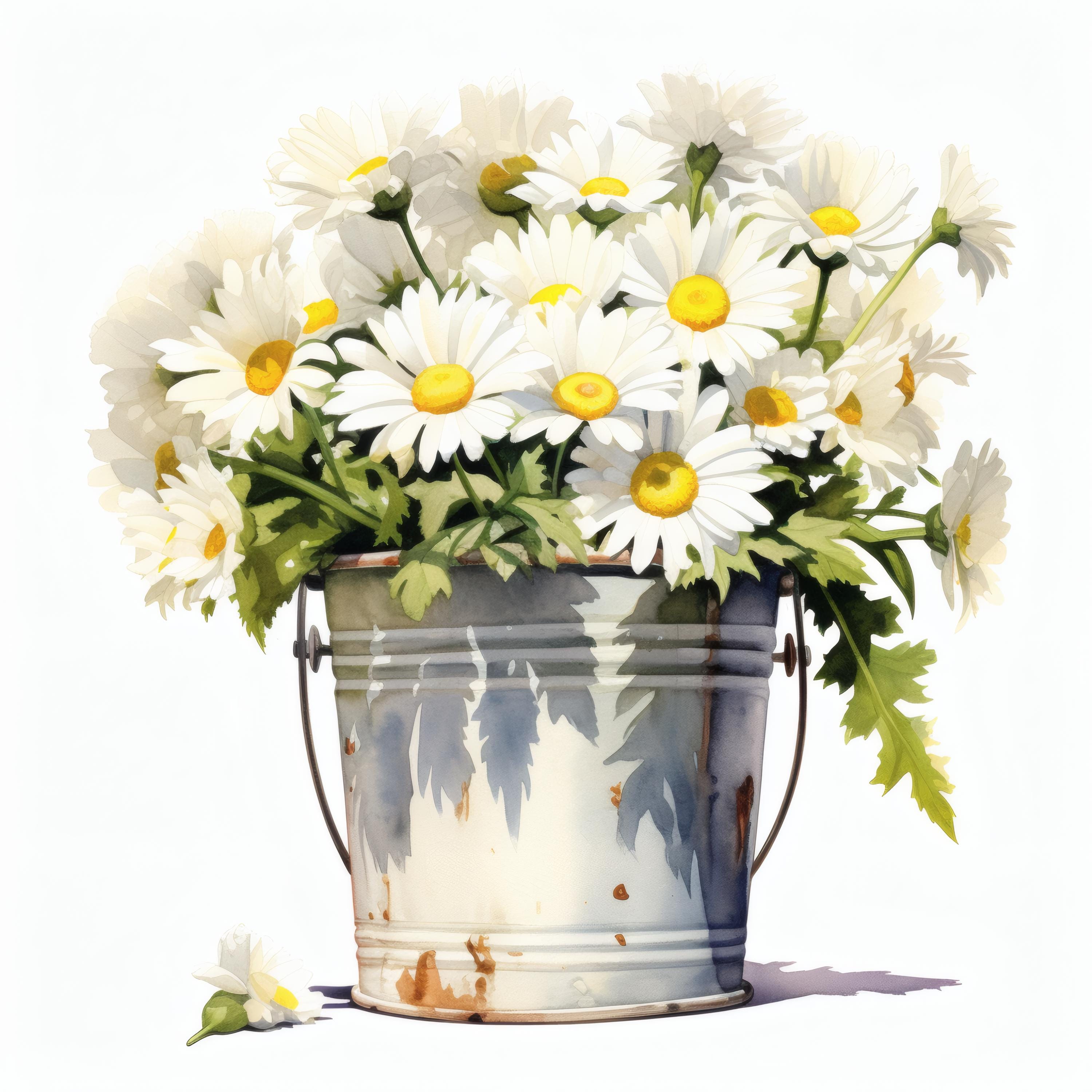 Daisies Bucket Clipart, White Flowers Images, 10 Watercolor Clip Art, Printable JPGs, Instant Download, Commercial Use, Paper craft