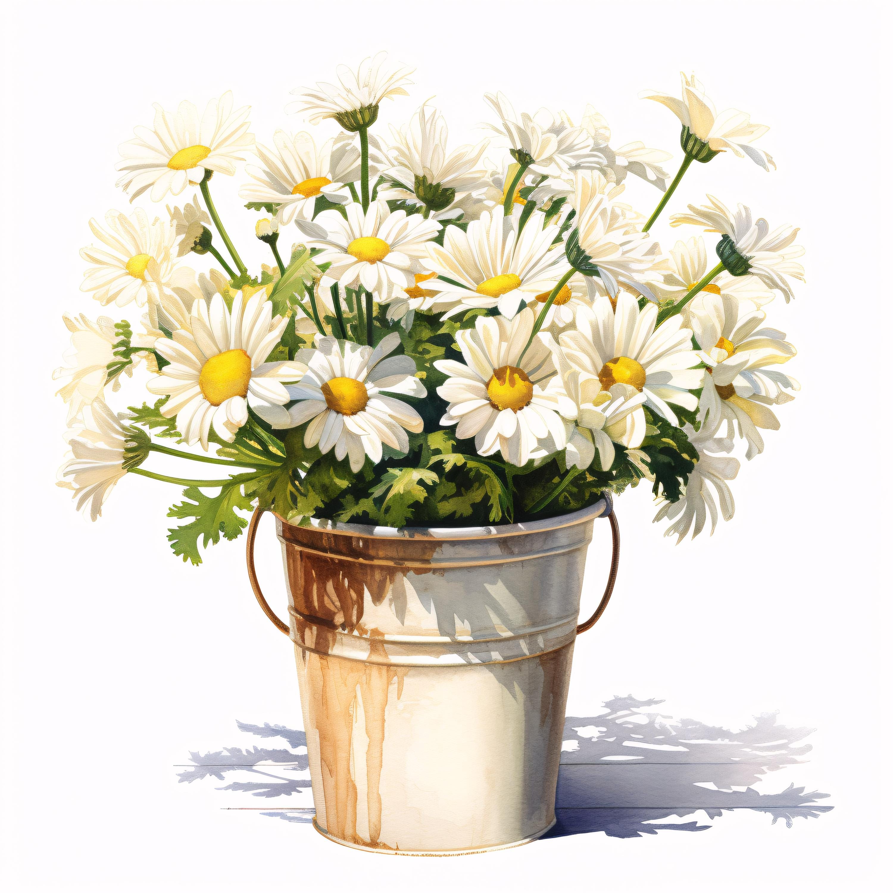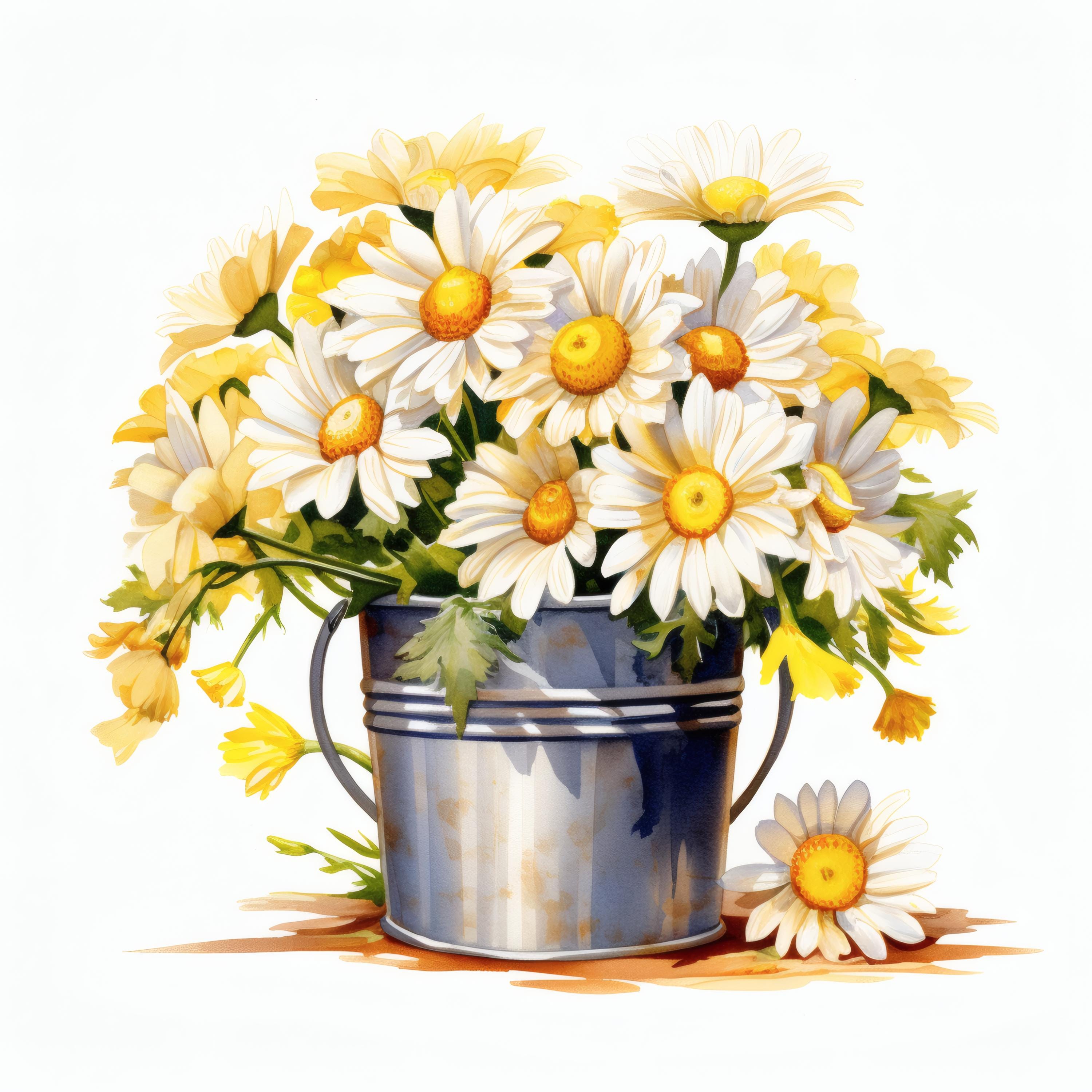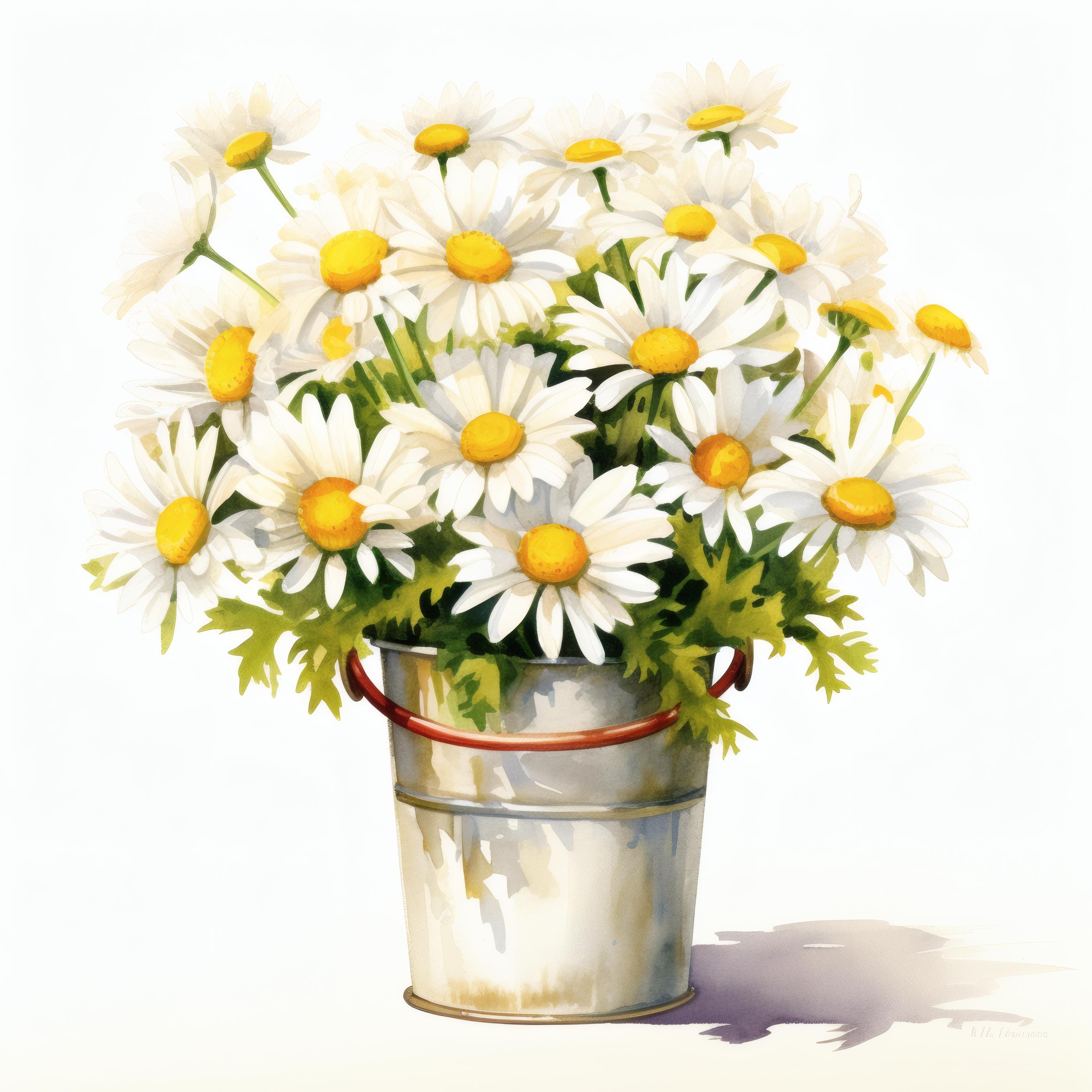 Daisies Bucket Clipart, White Flowers Images, 10 Watercolor Clip Art, Printable JPGs, Instant Download, Commercial Use, Paper craft