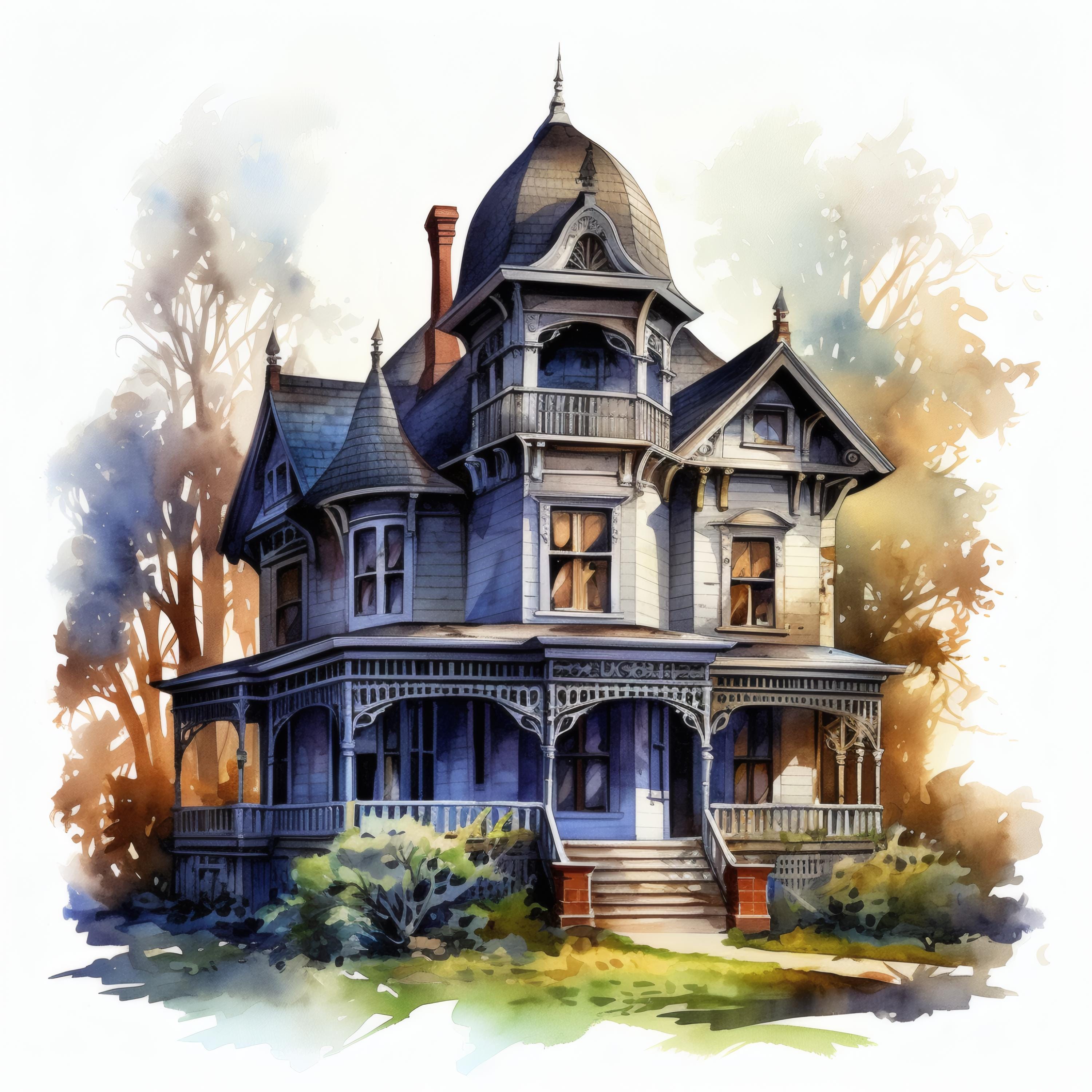 Haunted House Clipart, Spooky Mansion Images, 10 Watercolor Clip Art, Printable JPGs, Instant Download, Commercial Use, Paper craft