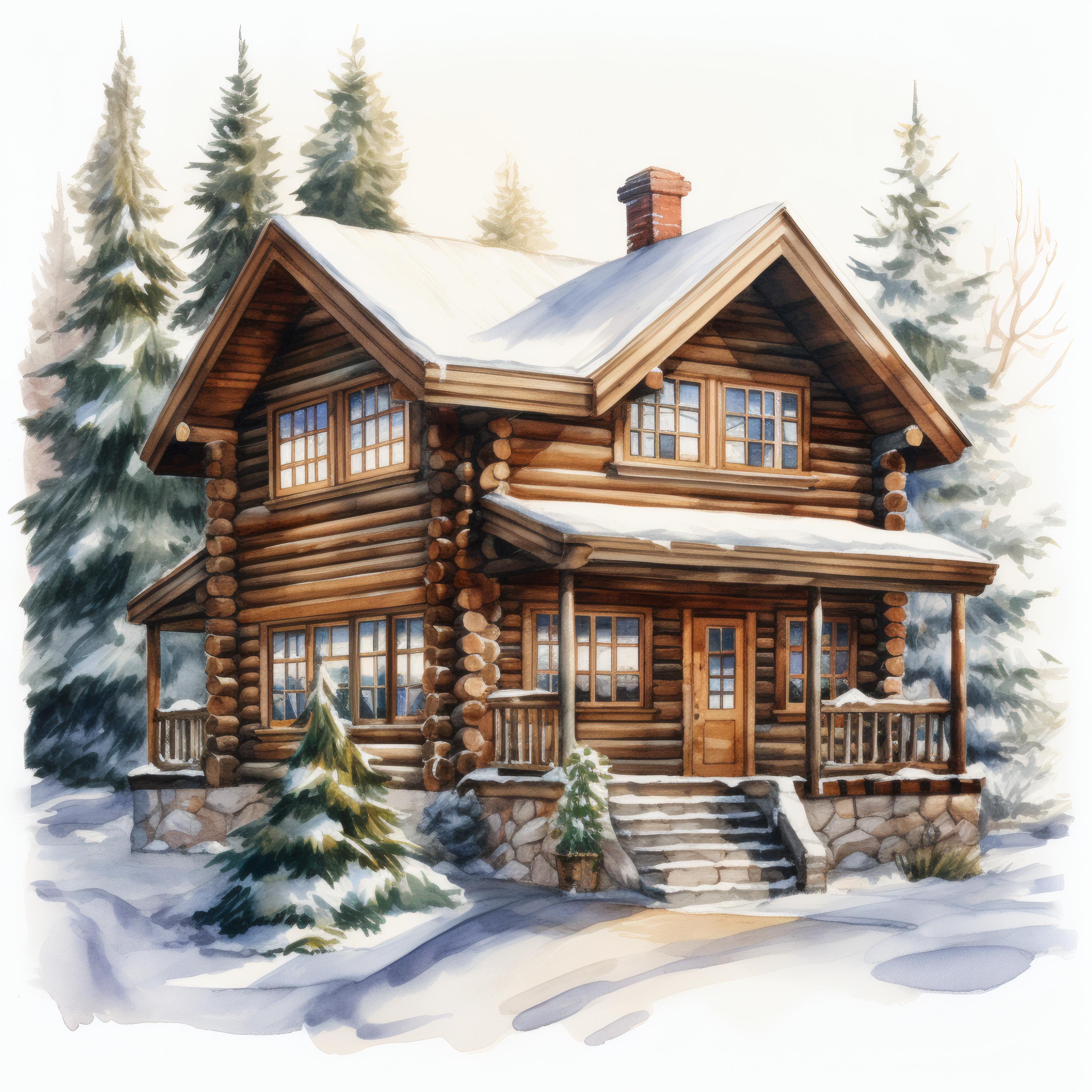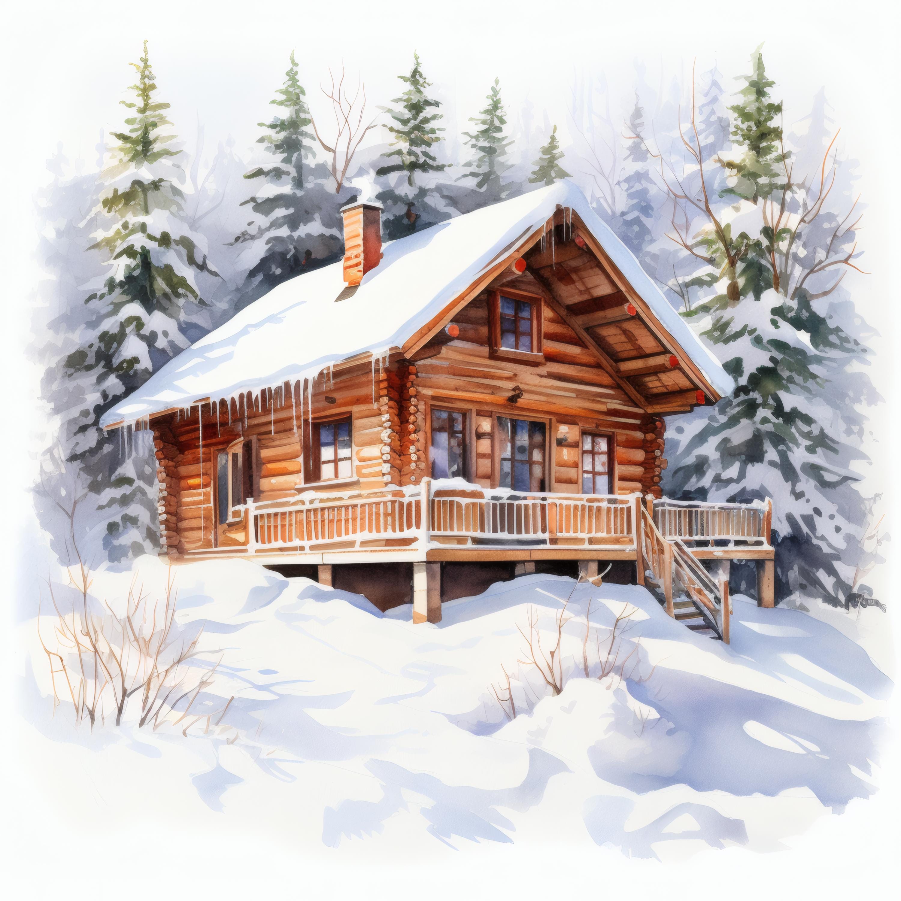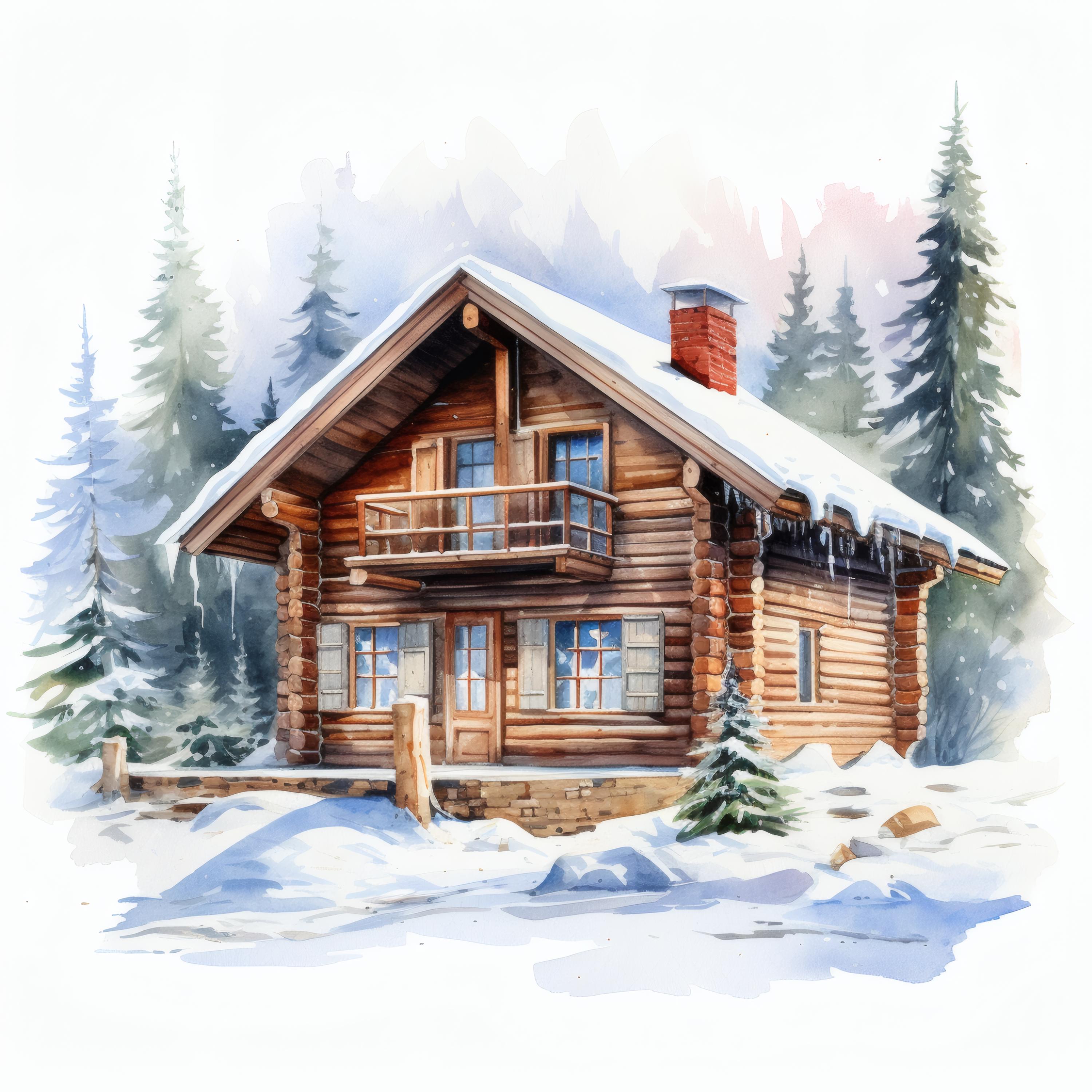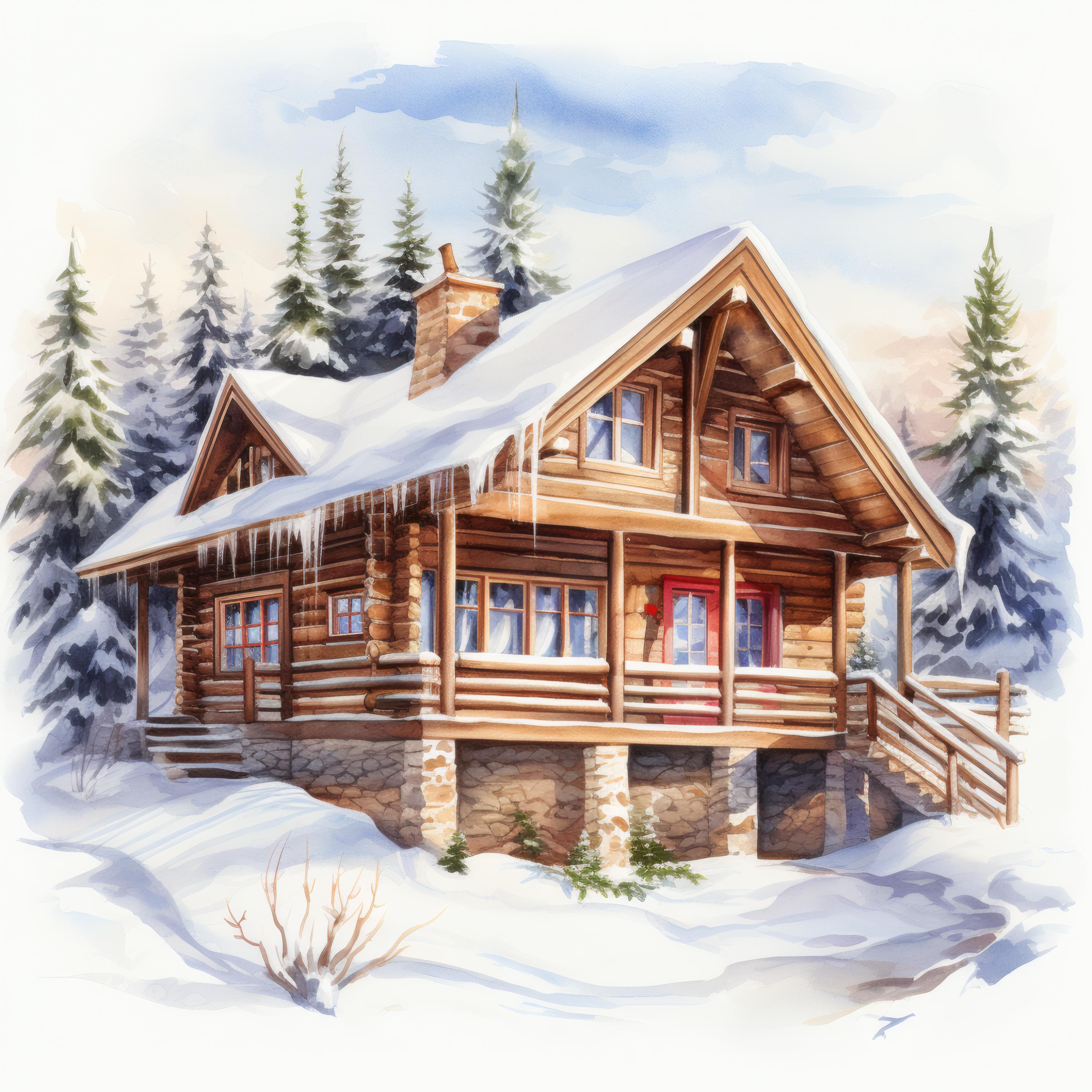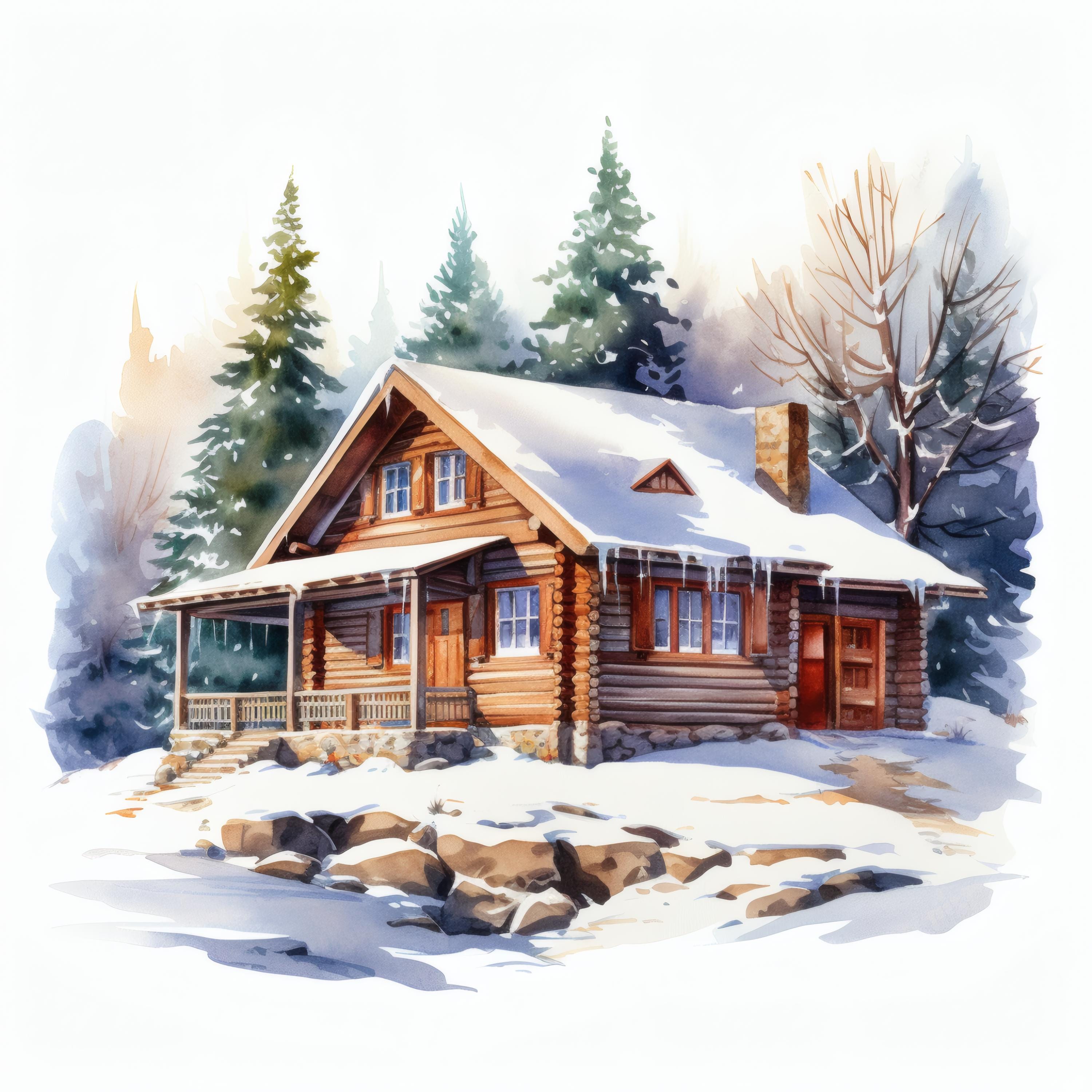 Winter Cabin Clipart, Snowy Christmas House Images, 10 Watercolor Clip Art, Printable JPGs, Instant Download, Commercial Use, Paper craft